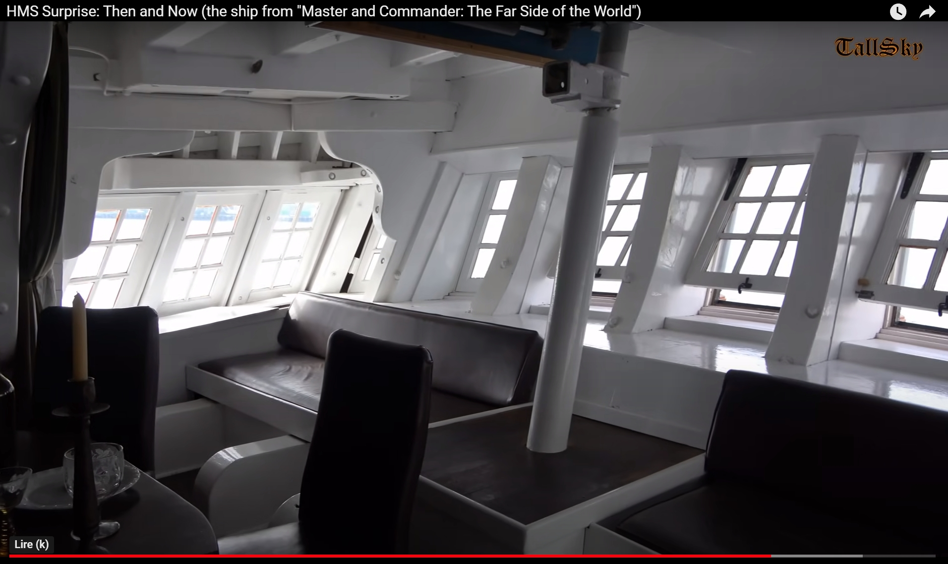 Pour Ned, mon troisième perso, je vais faire un clin d'œil à Stephen Maturin, l'inséparable compagnon scientifique de Jack Aubrey ( romans de Patrick O'Brian et dans le film Master and commander). Donc j'ai en tête le look général. Par contre, si je suis quand même un peu le brief, je le ferai tout jeunot. Passons à l'environnement. Il me faut une cabine de poupe. Je voulais quelque chose de confiné. Quand on est des aventuriers, on est pragmatique, on utilise des moyens de transport rapides, pas trop gros pour être discrets, et quand même suffisamment armés pour se défendre = frégate fin 18ème siècle. Modèle choisi = le HMS Rose qui aujourd'hui a été transformé en HMS Surprise pour la nécessité du film Master and Commander. Voici une photo -