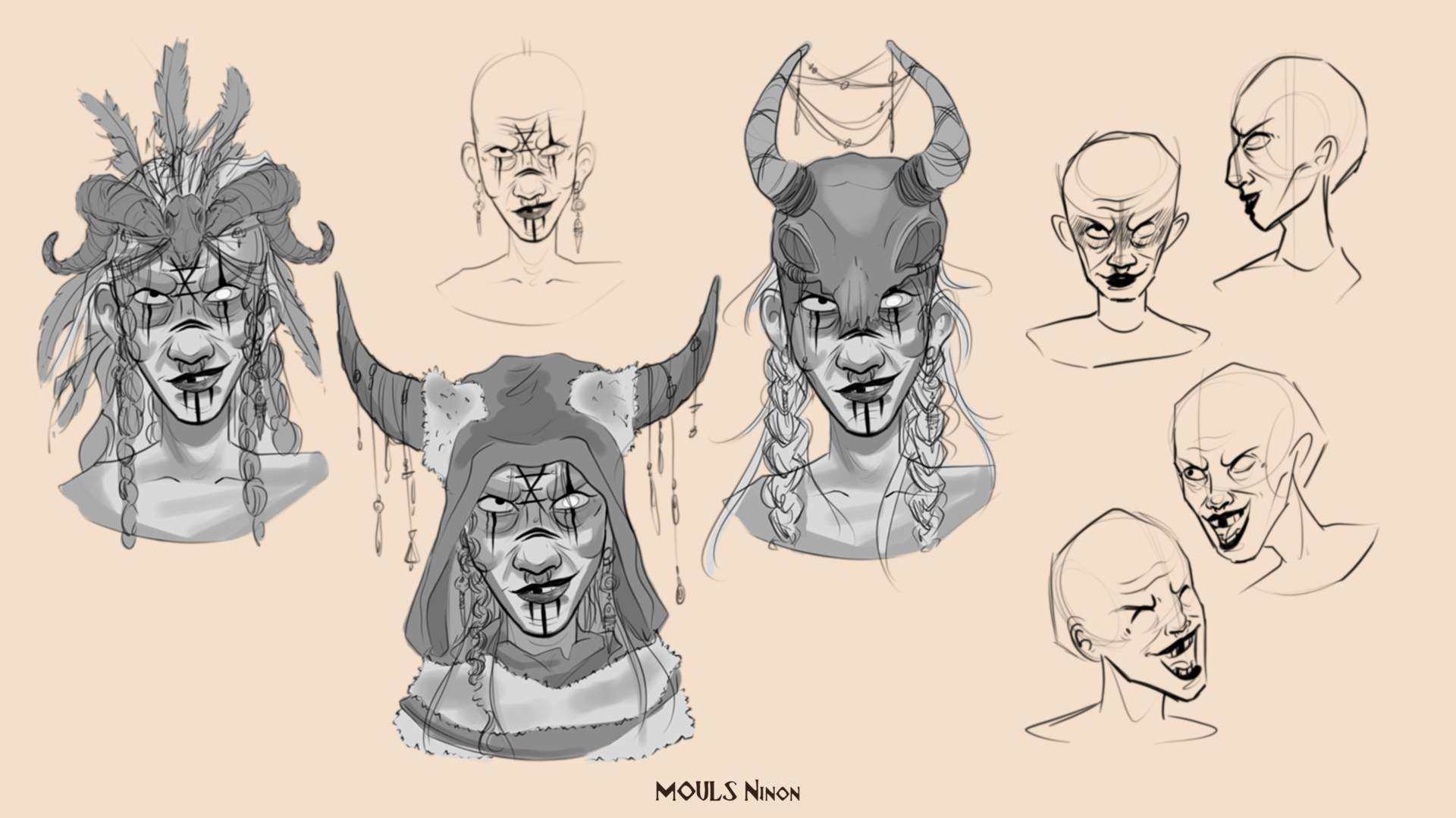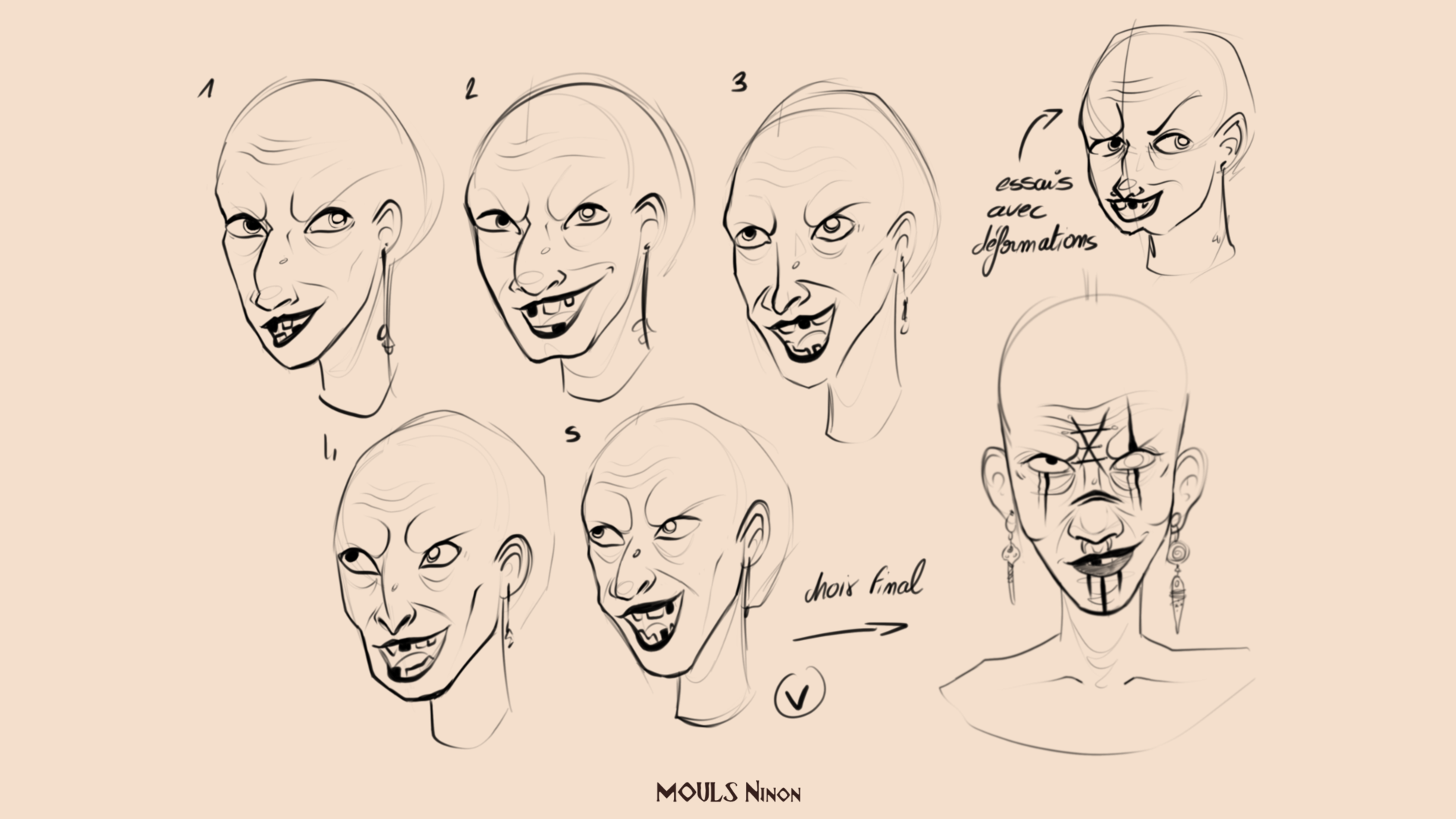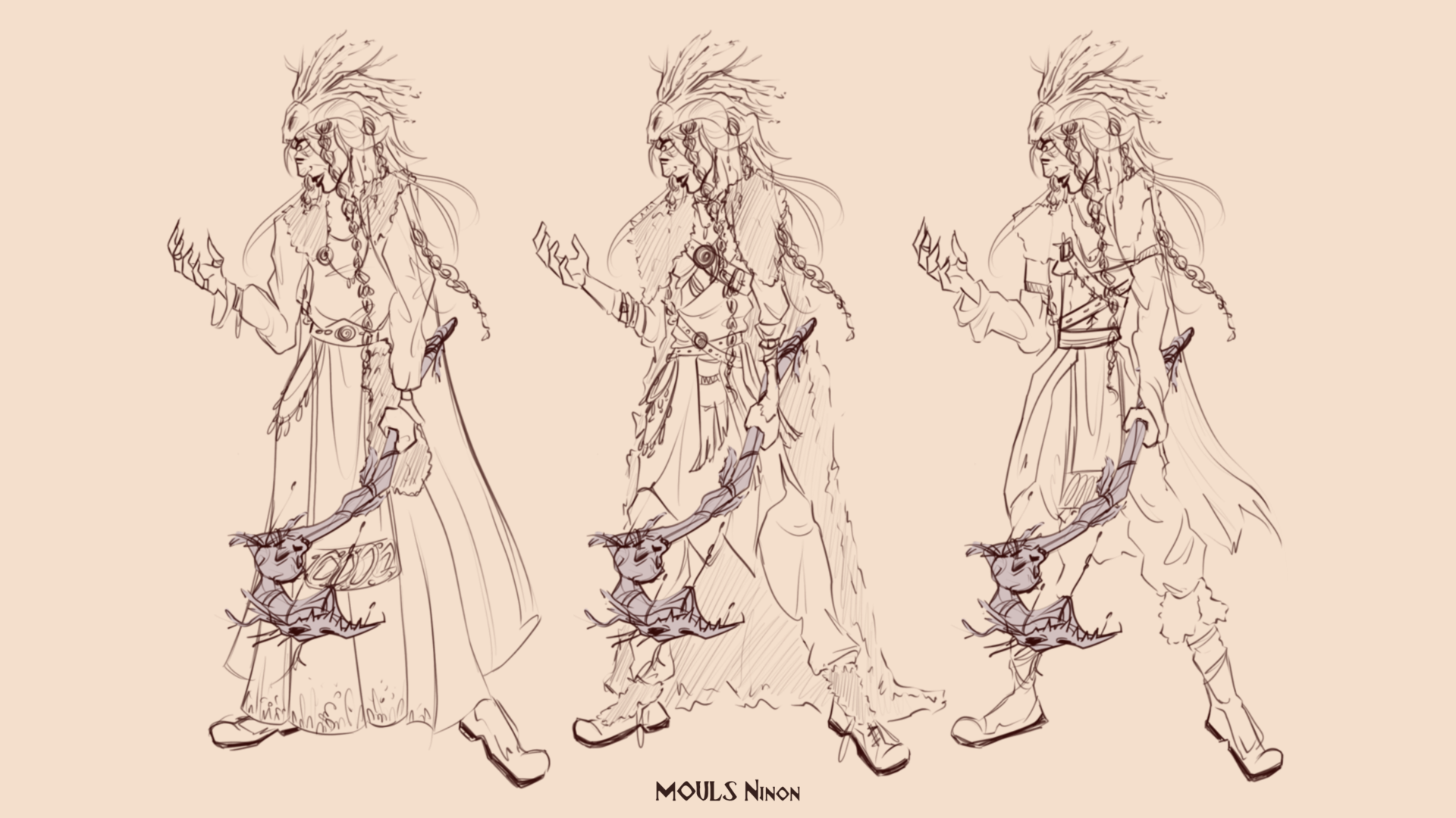Tests, de couleurs, wip, croquis etc.. Je me suis beaucoup amusée à créer et trouver le design de Ned, je l’imaginais un peu comme un mélange de Viktor et Silco dans Arcane. j’ai travaillé un props de machine à bras mécaniques qu’il a dans le dos pour l’aider dans ses fouilles archéologiques et ses études. Je partage aussi quelques screenshots du timelapse de mon concept art ainsi que le premier croquis.