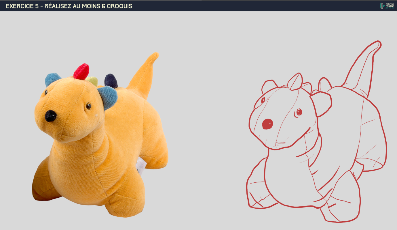 Bonjour à tous ! Je me décide enfin à poster ce que j'ai produit tout au long du chapitre 2. Pas facile, mais j'ai besoin de me confronter à des remarques/critiques (allez y, n'hésitez surtout pas ^^). Voici les premiers travaux : C'est pas fou fou... Je vais recommencer cet exercice pour me délier un petit peu ! Ensuite, les croquis simples : Autocritique : Traits bien tremblants mais j'ai aimé la découverte de cette technique tracer/gommer 🙂 Choix des brush à revoir aussi, mais j'expérimente, j'aime bien faire comme ça aussi Puis, il y a eu les tracés parfaits : Forcément ça tremble pas. Technique qui m'a aidé par la suite, perfectible et je pense que les possibilités sont énormes Maintenant le vaisseau. Et je me rends compte, en voulant le poster, qu'il n'est pas fini : Il faut vraiment que je m'améliore sur les ellipses et la perspective... Le crane : Je trouve que les lignes sont un peu trop fines et que je me suis un peu trop approprié les proportions entre la boite crânienne et la face. J'ai vraiment aimé cet exercice ! La peluche : Je n'ai pas l'impression que ça soit mauvais (vraiment, dites le moi, si c'est le cas). C'est un de mes objectifs de savoir dessiner à partir d'observation de la vie réelle (photo ou en direct), donc je vais faire pas mal de croquis d'après photo dans un premier temps, je les posterai surement 🙂 J'ai essayé d'être plus rapide sur ce croquis, que ça soit une préparation pour une future illustration. Je ne sais pas si je suis sur le bon process ou s'il faut que je capture plus de détails ? Petit test de hachures (mais c'est difficile en fait !), l'épaisseur de trait n'est pas bien choisie du tout en fonction des endroits, à reprendre ! Et voila ! On est arrivé au bout de ce que j'avais à vous montrer. J'attends vos retours les plus sincères possibles (même s'ils sont rudes, je les prends !) et à très vite !