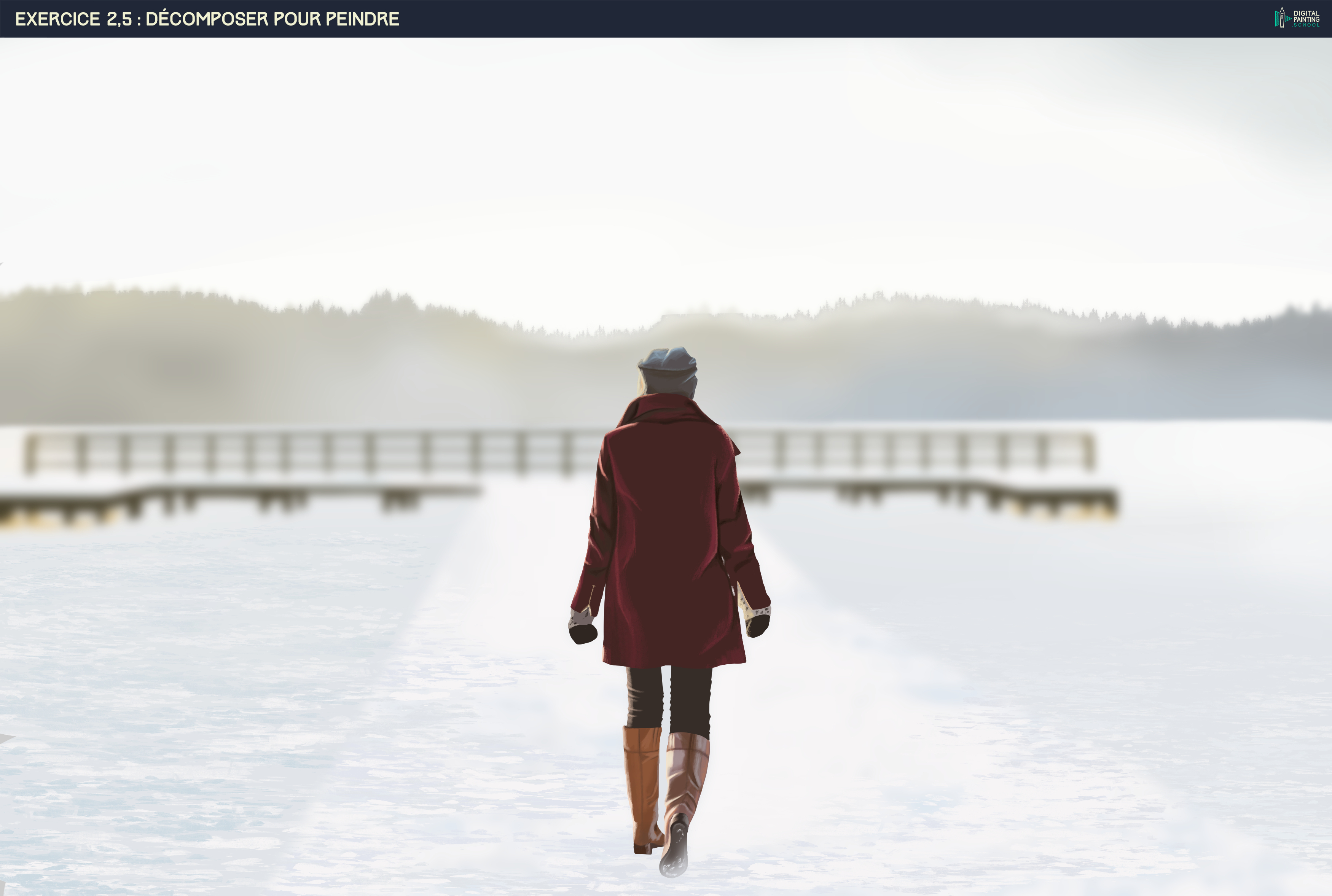 Bonsoir pour ceux qui verront au moment où je poste mes premiers exercices! Le premier exercice me semblant pas vraiment nécessaire à montrer, mais que j'ai malgré tout fait pour me remettre à la formation, j'ai pu faire l'exercice 2, ainsi que le 2.5 (que je considère comme fini, mais encore améliorable)! Je me suis assez bien appliqué sur le second exercice, j'ai pris mon temps et je suis très content de la première colonne, car j'avais encore mes anciens essais et ai pu voir un avant-après... Et le 4ème, en valeur de gris me satisfais bien plus, même si j'ai eu des difficultés à choper le coup, comme le troisième! Pour le workflow, j'ai exceptionnellement utilisé un masque d'écrêtage pour ne pas déborder du gris, ainsi que des autres formes, où le premier calque était l'aplat que l'on pouvait le mieux voir, puis j'ai posé et ensuite mélangé progressivement les couleurs des colonnes couleurs, et changé d'opacité de brush pour le dernier, par rapport au petit coup qui traverse net la forme! Pour l'exercice 2.5, j'avais posé les base de couleurs de la dame, un peu donné de détails, puis j'ai focus le décor, comme c'était un de mes points faibles absolus, j'ai posé les aplats à l'aide du croquis du décor, puis après j'ai posé plus de choses , et je me suis permis d'expérimenter un peu avec le flou gaussien pour le ponton, puis pour coller à la luminosité un peu jaune des cimes, j'ai utilisé un brush doux pour répliquer cette sorte de brouillard qui donnait de la luminosité aux cimes malgré tout, ainsi que de petits calques d'incrustation pour coller aux jaunes un peu chauds de la référence! Je sais que je pourrais continuer à aller plus loin sur l'exo, et encore allonger le temps de travail, mais pour l'instant, je vais le considérer comme fini pour le moment! Je suis déjà super content d'avoir pu réussir à vraiment lâcher un peu le line, et de développer le côté peinture, donc c'est du travail imparfait, mais j'ai essayé de travailler intelligemment, et de respecter au max les objectifs, et c'était plaisant! Bref, hâte d'avoir les avis de tout le monde, les petits conseils pour améliorer le tout lorsque je fignolerais l'exo 2.5 pour le détail des bottes et très possiblement les manches! Mercé beaucoup, et hâte de recevoir vos conseils!