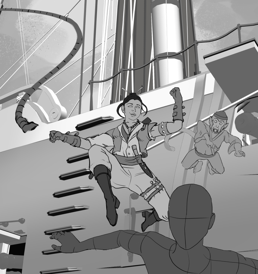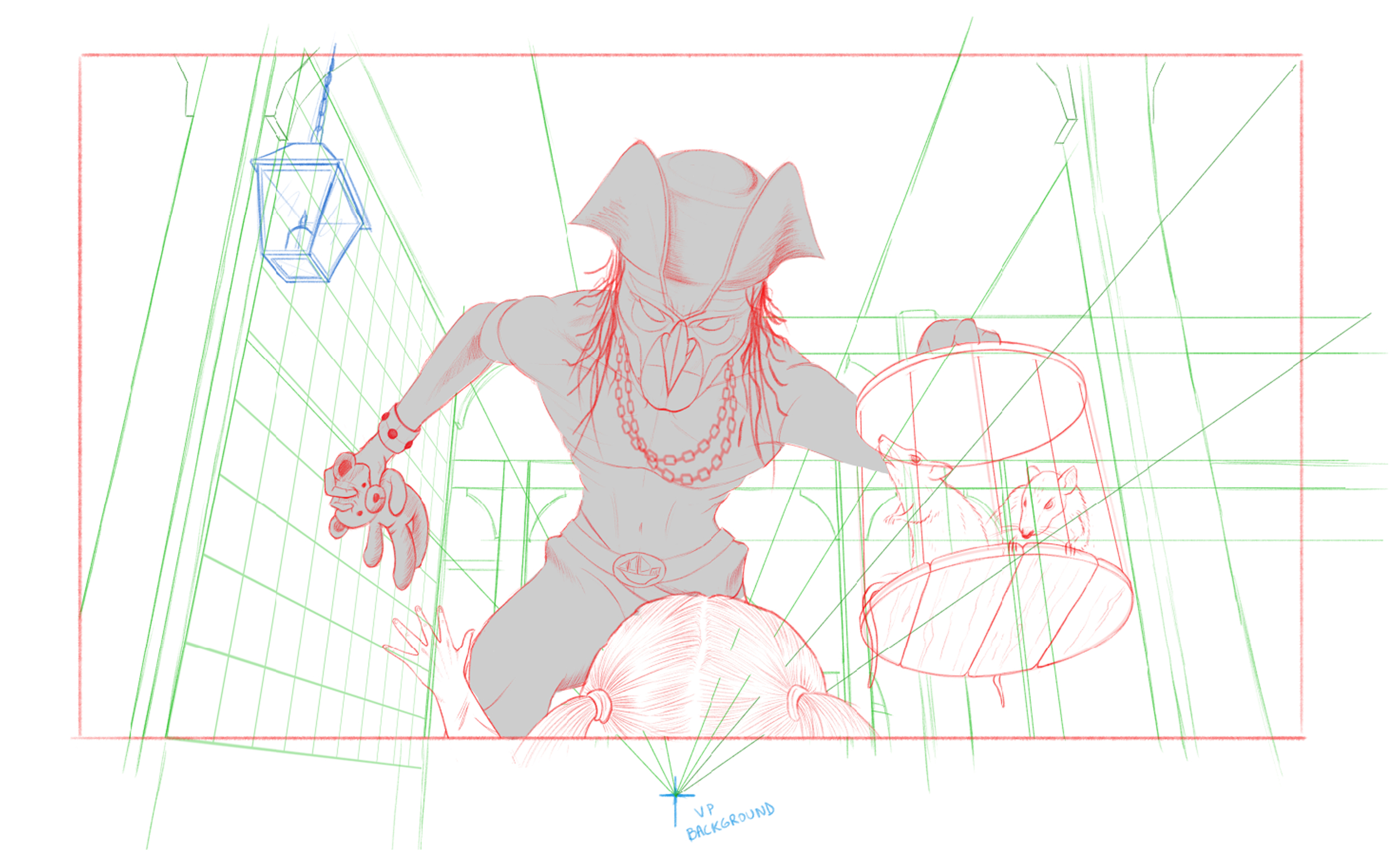 J'ai bien avancé sur mon croquis et ça n'a plus rien à voir avec mon premier dessin. Là c'est le gros chantier de perspective, des traits partout et une cinquantaine de calques. Je vais bientôt pouvoir passer aux valeurs.