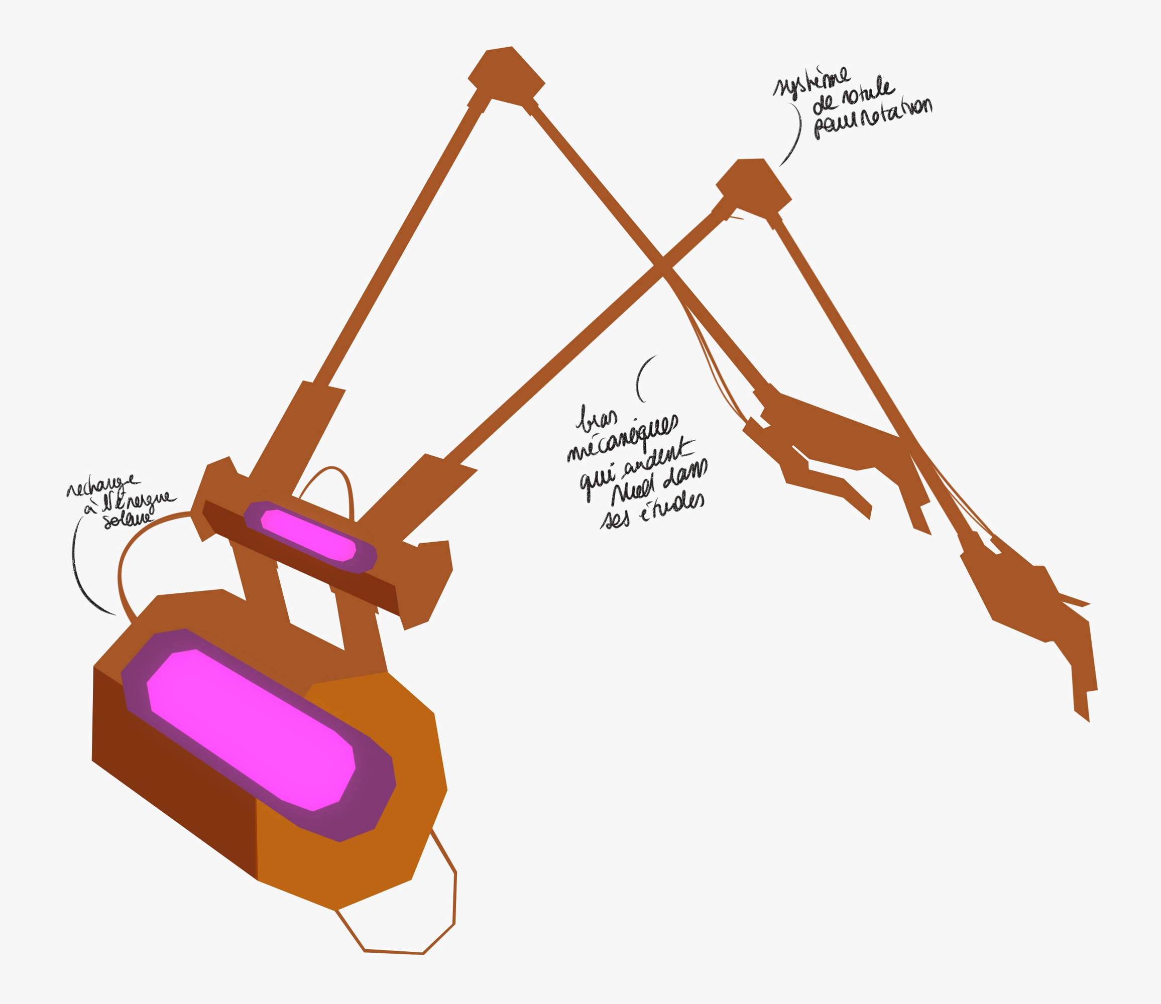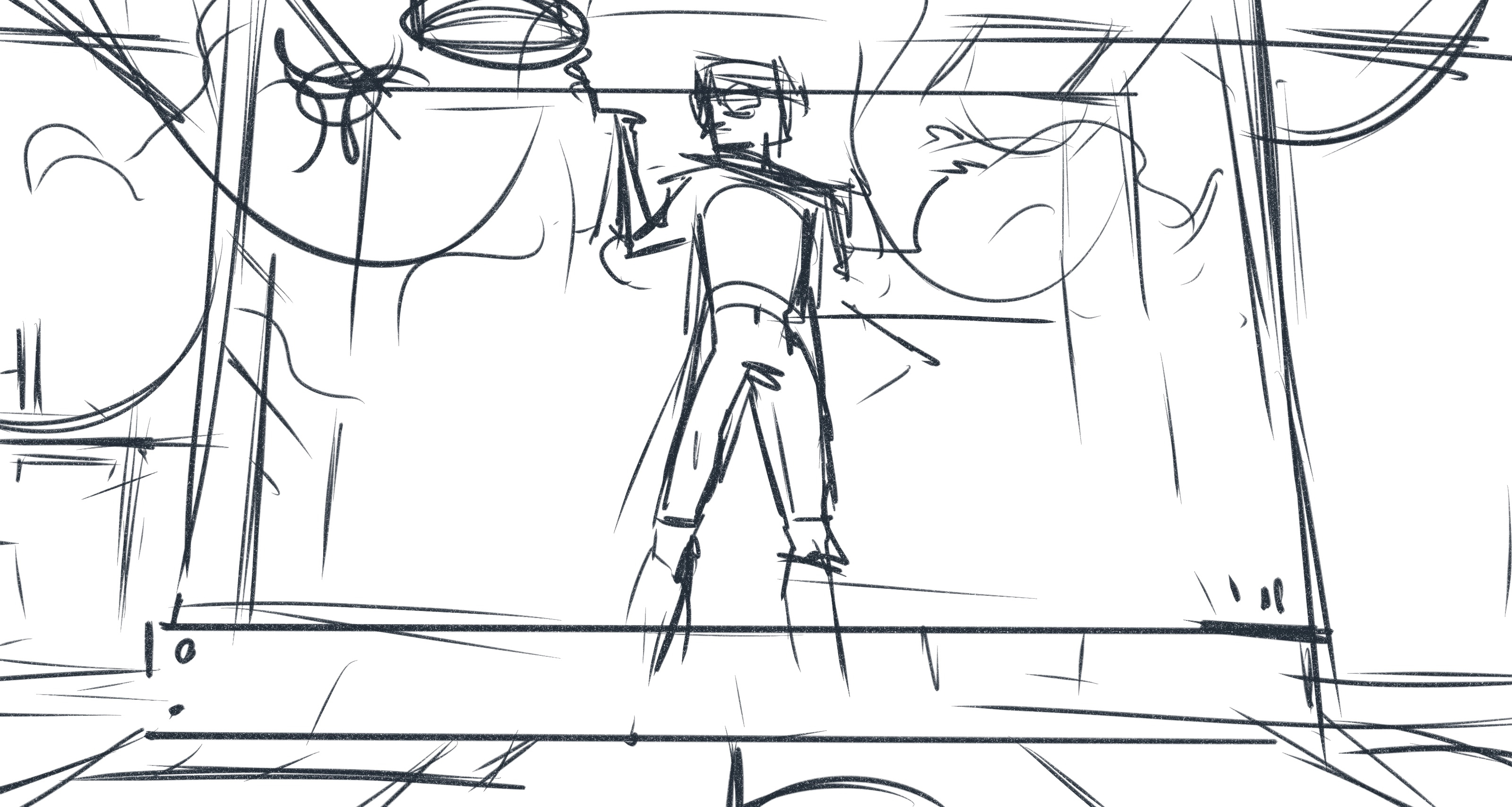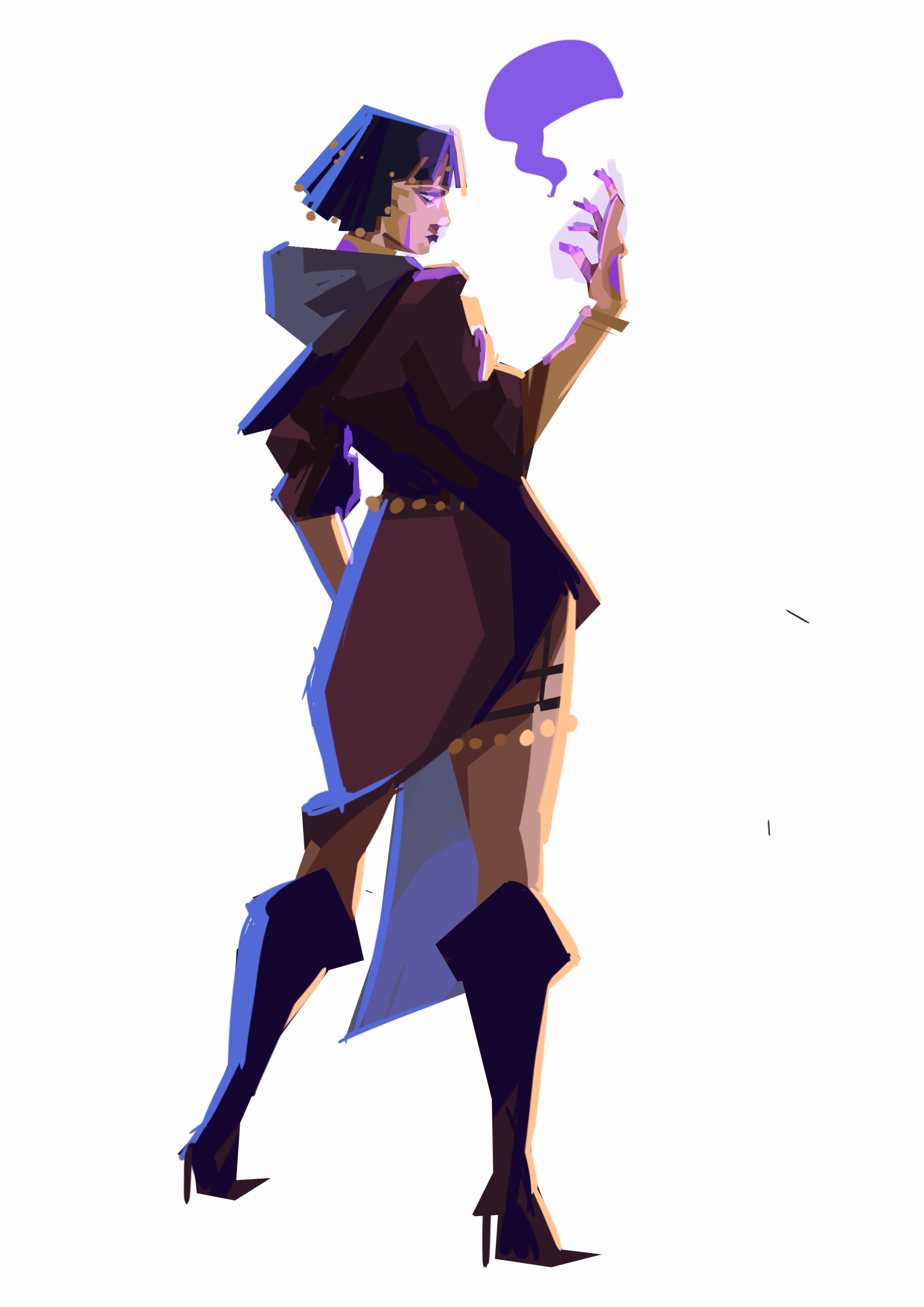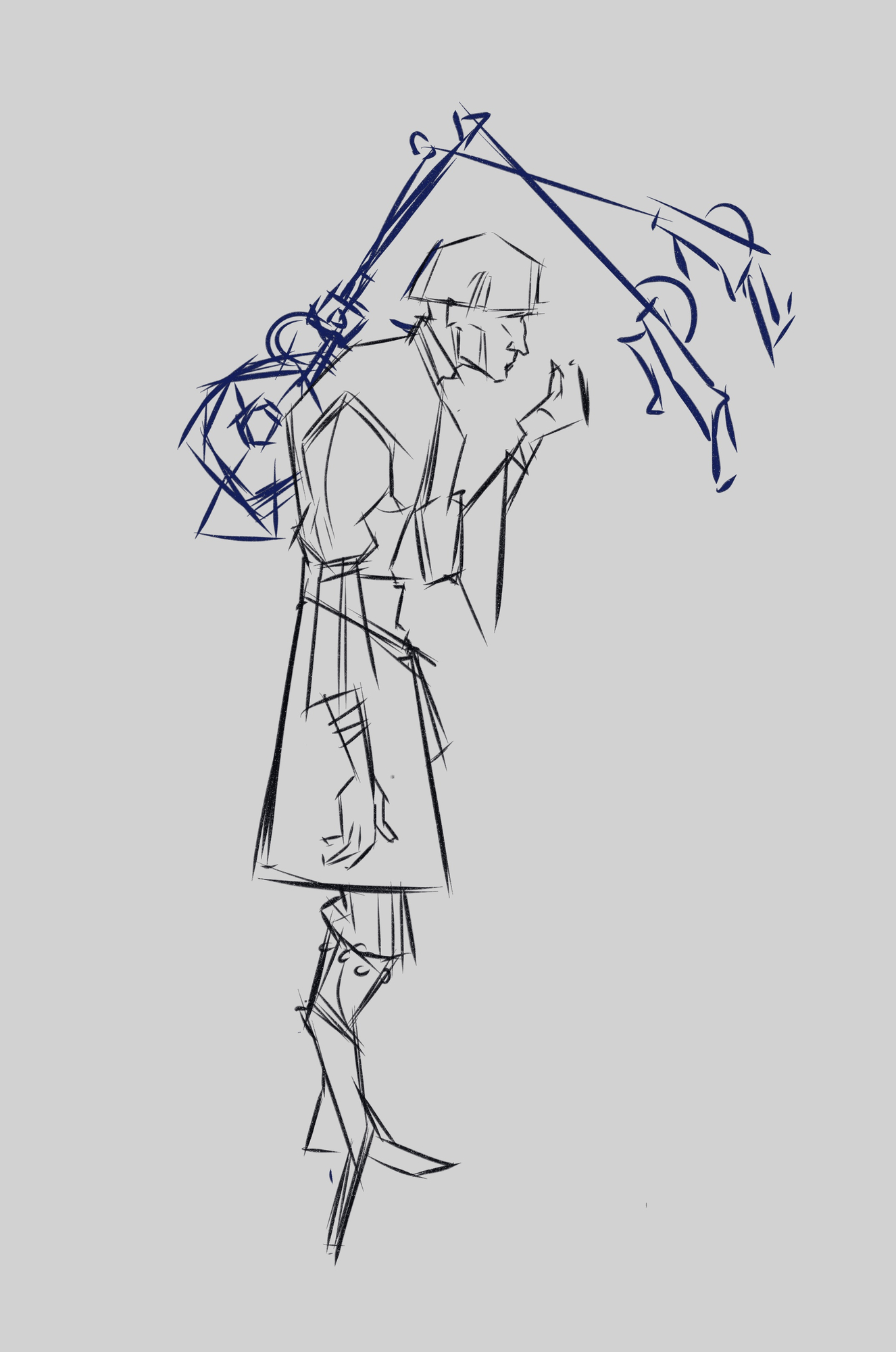Tests, de couleurs, wip, croquis etc.. Je me suis beaucoup amusée à créer et trouver le design de Ned, je l’imaginais un peu comme un mélange de Viktor et Silco dans Arcane. j’ai travaillé un props de machine à bras mécaniques qu’il a dans le dos pour l’aider dans ses fouilles archéologiques et ses études. Je partage aussi quelques screenshots du timelapse de mon concept art ainsi que le premier croquis.