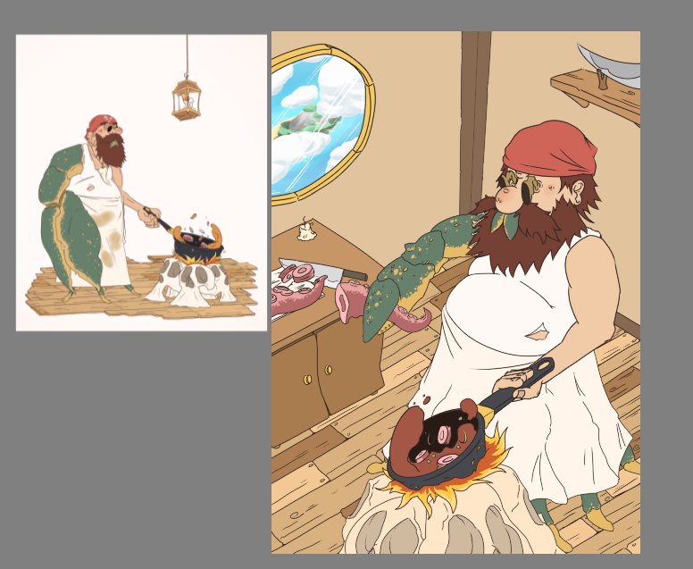 Sympa ton perso. Sa main gauche est mal positionnée. Essaye de prendre une poêle comme lui et tu vas vite te rendre compte que ce n'est pas facile 😅 Et si j'ai bien compris, il s'agit d'un hublot par lequel on voit une île comme si il était dans un navire volant ? Si c'est le cas il faudrait faire plus épais l'intérieur du cercle pour donner un effet de profondeur. Là on dirait qu'il s'agit d'un tableau. (j'espère que c'est compréhensible) Bonne continuation !- 7 réponses