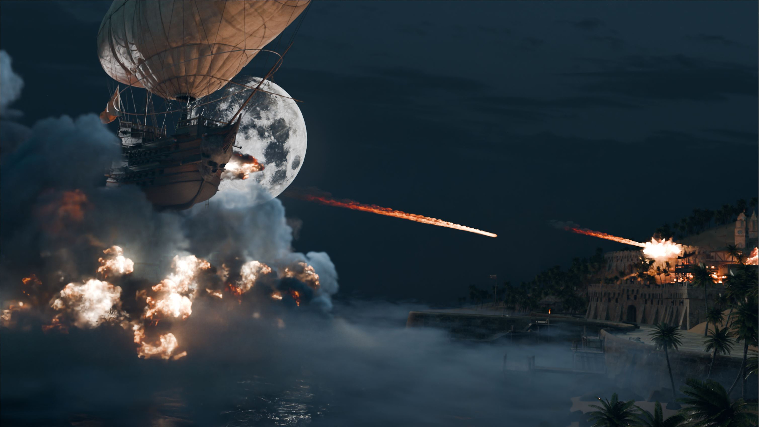 Perso j'aime bien. On dirait que tu as reculé la scene et donc ça la rends encore plus épique On a une sensation que le navire est plus long que la réalité (et j'aime bien) je pense (donc perso) que le navire peut être étirer (longueur) pour le rentre encore plus enorme. La on voit presque l'arriere hors je trouve plus interressant que l'arrière soit dans les nuages. Si pas clair, je te fais un petit PO si tu veux. J'aime l'idée de la lune mais je n'arrive pas à savoir si ca marche ou pas. Je me suis posé la question de faire la lune rousse ou jouer avec sa position. Bon et j'imagine bien que certains Palmier vont être en feu 🙂
