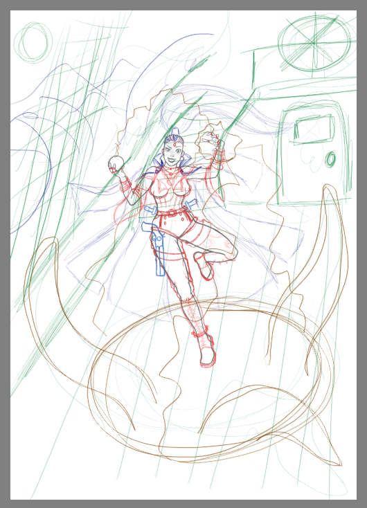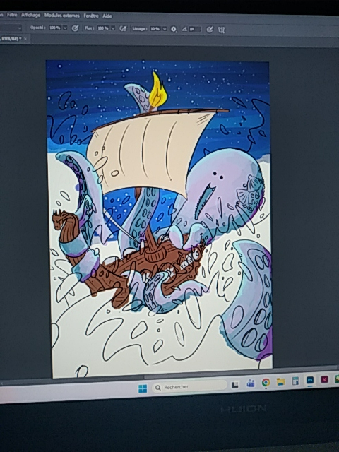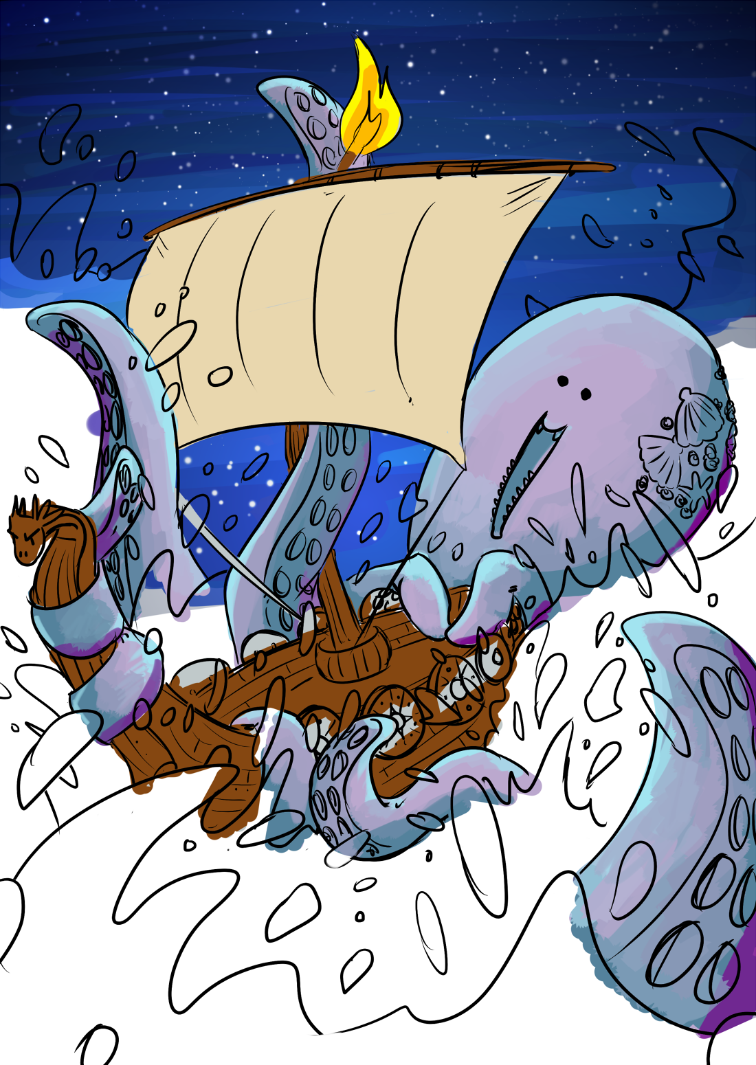 Voilà mon retravail du début d'aprem, je continue après une petite pause. J'ai revu la position du bras, et la compo générale. En gros, elle invoque un kraken sur le pont principale d'un bateau par une nuit de tempête... Est-ce que je sors de ma zone de confort (qui se limitait à des bonhommes batons et des petits emotes moches et mal fait) ? Oui. Est-ce que je le referais ? Absolument. Est-ce que je m'éclate ? A donf. -