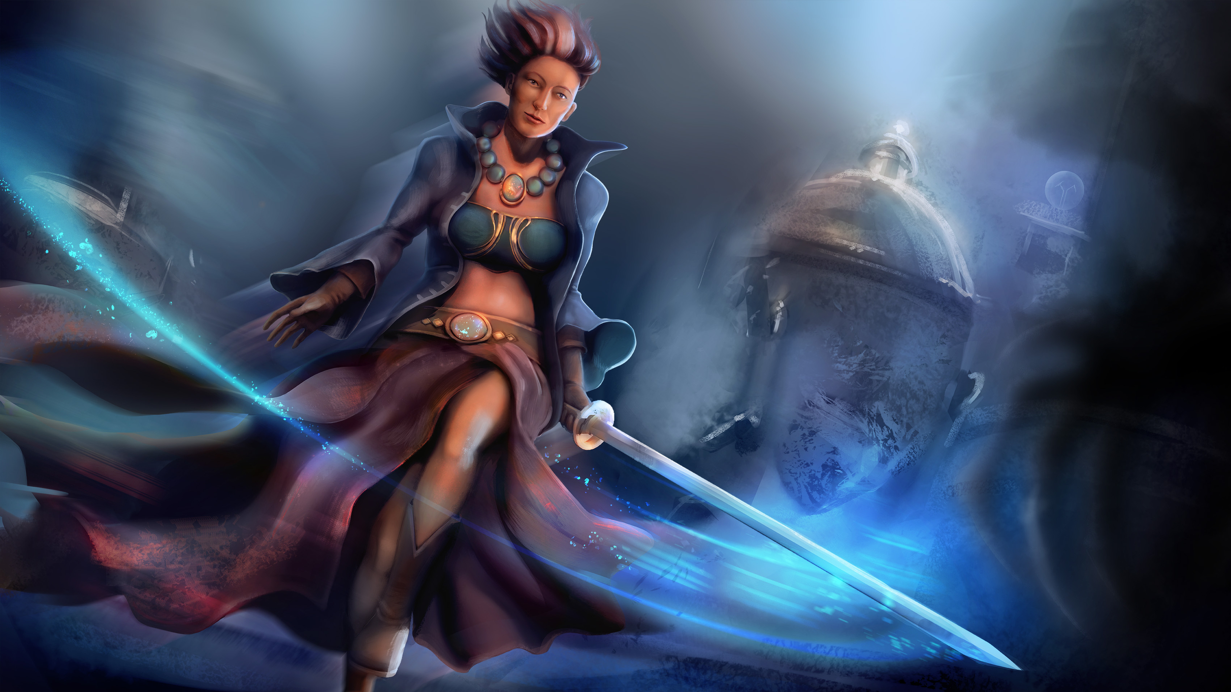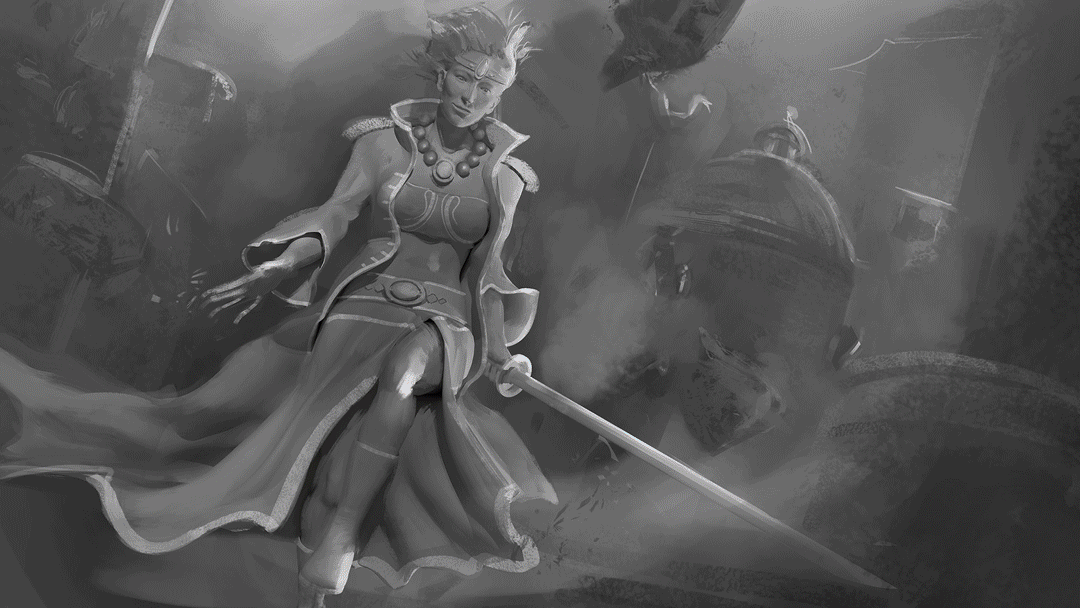 Hello, voici l'illustration à refaire fin de la partie. Je vais tenter un splash art mais ca sera un vrai défi pour moi parce que je me rends bien compte des lacunes. Ici je ne vais pas aller plus loin dans les détails parce qu' en essayant de travailler ""vite"" , au final, ma base n'est pas bonne. Le personnage est trop raide (j'y passerai une semaine si nécessaire mais j'obtiendrai une pose dynamique la prochaine fois), je n'ai pas vraiment réfléchi à un storytelling (je vais vraiment bosser là-dessus) et, franchement, j'ai traité les couleurs comme une sauvage 🤠 ca me prendra des jours pour harmoniser les nombreux détails que je compte ajouter en fin de partie. Allez, contente de débuter cette partie 3