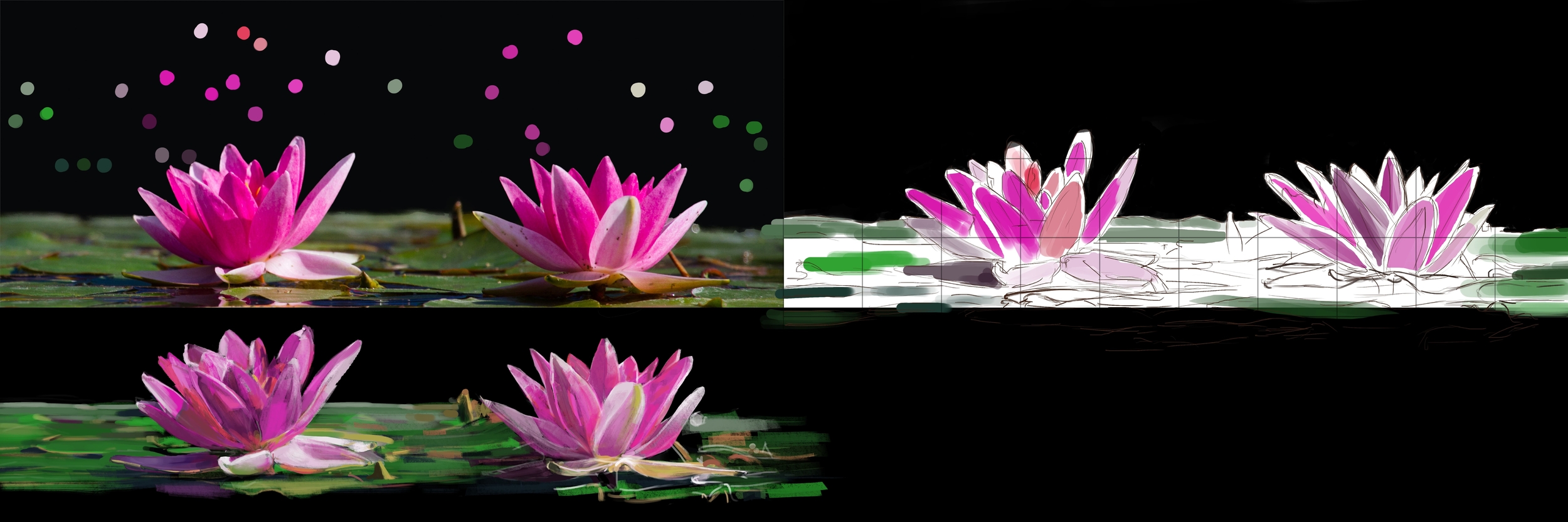 Pour les nénuphar c'"est bien ! -il manque juste un peu plus de contraste dans tes ombres sur les partie a gauche sur les deux -et tes reflet dans l'eau sont trop lumineux et saturés en couleurs tu peux venir les atténuer et leur rajouter un léger flou gaussien pour l'exo du petit monstre : tres sympas ton petit monstre ! -un petit bémol c'est qu'il est un peu trop vu de face , une vue un peu plus trois quart aurait pu lui rajouter un peu plus de volumes - tu peux aussi lui ajouter une lumière un peu plus chaude pour éviter l'effet monochromatique et tes ombres plus froide egalement idem pour ton fond qui est un peu trop désaturé en couleur pour le moment ! le noeud sur sa tete fait très plastique pour le moment due au reflet que tu lui a ajouter , et ca manque un peu d'ombre occlusion avec plus de contarste egalement contraste