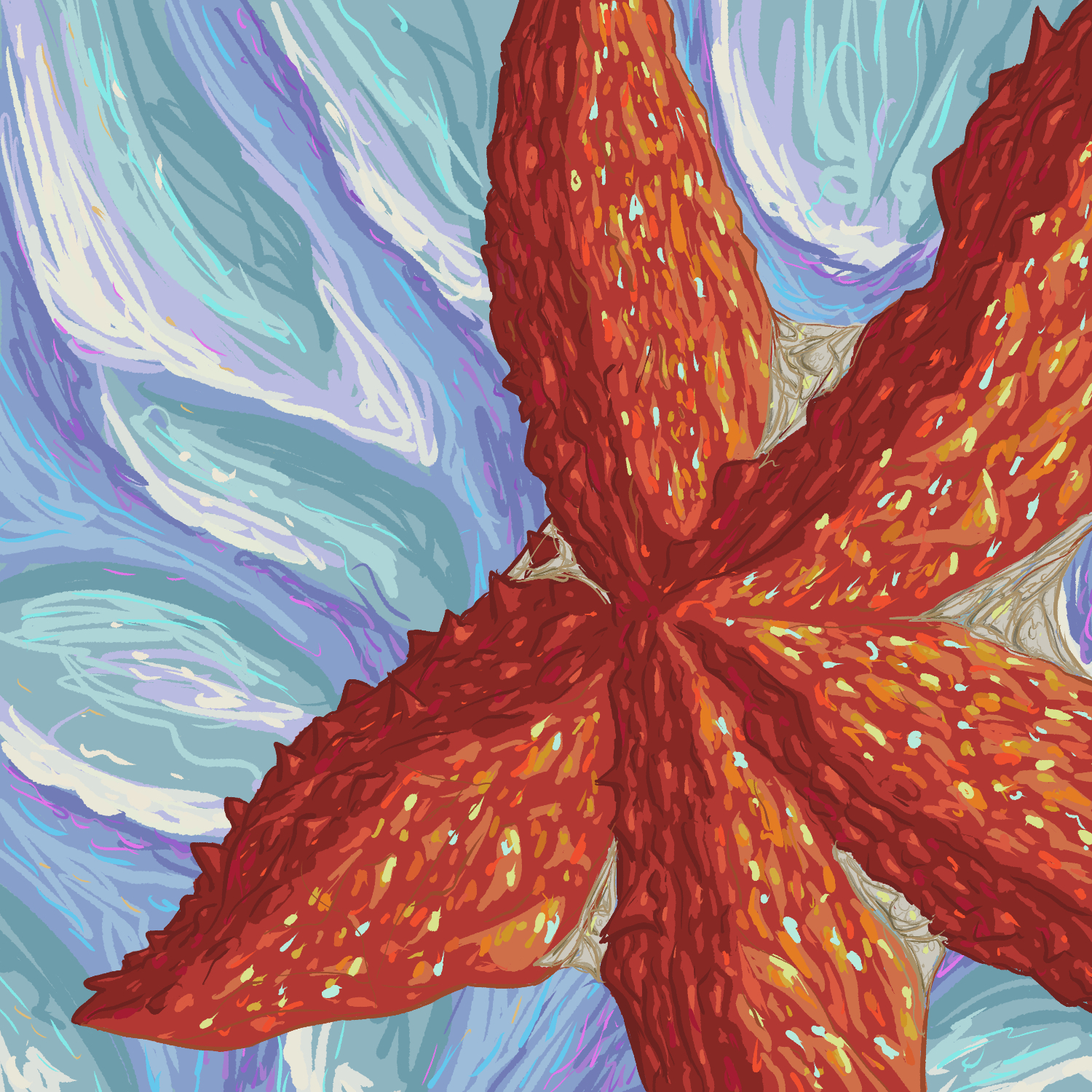 Bonjour tout le monde ! @Shelter Très chouette ton étoile géante et la perspective fonctionne je trouve 🙂 @June Très mignon et très sympa comme modèle pour les ongles. Ça rend très bien avec l'esprit de détente. Pour ma part, voici ma participation. Si le cerf a été épargné de la corruption, ce ne sera pas le cas de l'étoile de mer. Je vous présente une nouvelle espèce découverte cette année : la stella manus diaboli, avec des pics sombres, des yeux rouges pour voir sur 360° et des pitites patounes ressemblant à des doigts humains. Ne la mettez pas sur votre main, elle vous collera et la dévorera à petit feu 😁. Inspiré des monstres de Monster Hunter Wild et des mimics de Dark Souls.