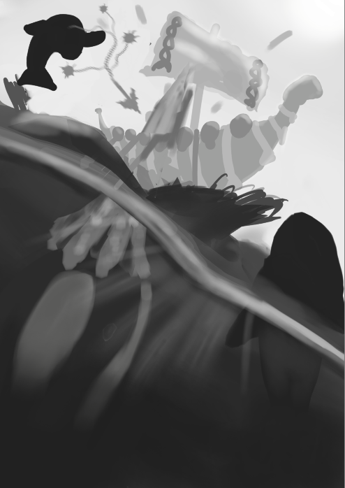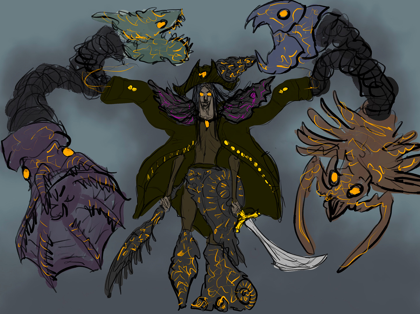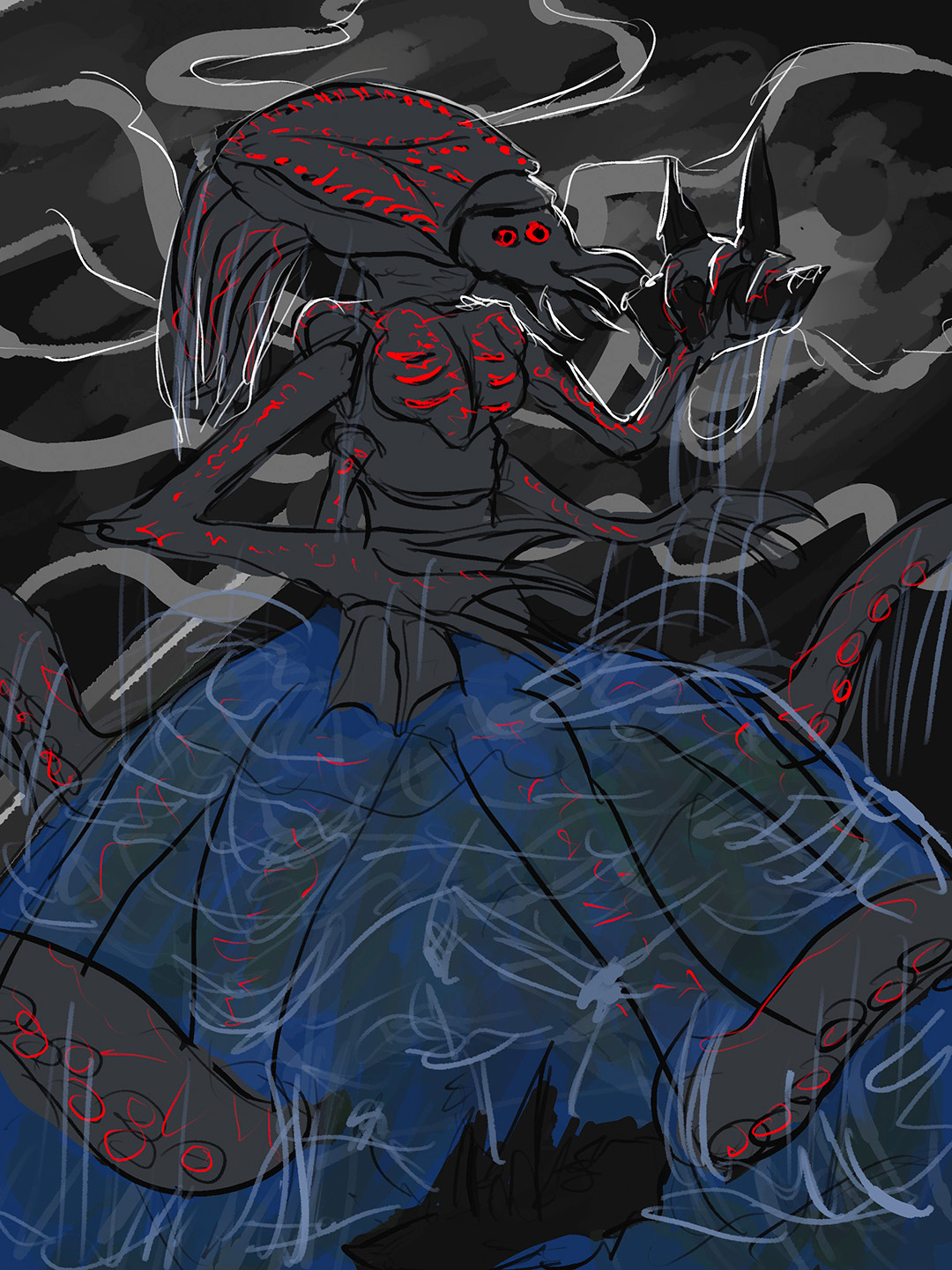 Salut à tous, Nouveau challenge DPS rime avec nouveau dépassement de soi. J'ai bien aimé progresser de challenge en challenge et je vais tenter de mettre la barre encore plus haute ! Même si j'ai quelques idées pour d'autres concepts (Iceberg, Crève-Feu et sa monture ou encore le Nidhögg), je vais commencer à plancher sur les 4 suivants : LE KRAKEN Pour le kraken je vais partir sur une silhouette féminine, avec le bas de son corps qui ressemble a une robe formée de tentacules. Pour le haut du corps, je vais plutôt partir sur un mélange lovecraft/alien, une sorte de calamar a la tête démesurée et un corps avec 4 membres géants capable de saisir les bateaux. Les doigts de chaque main forme les fameuses tentacules des récits qui s'attaque aux bateaux. La scène se veut dramatique, au milieu d'une tempête. La créature sera semi-transparente et aura de nombreux spots de bioluminescence (ici en rouge mais ça pourra évoluer). Dans cet univers, le kraken représente le coeur de l'océan. L'oeuvre sera réalisée a grand renfort de 3D (modélisation du bateau et du monstre). L'ILE-VOLCAN d’ISLA NUBLAR Impossible de faire l'impasse sur un concept avec des dinosaures. L'idée ici est qu'une sorte de dinosaure ailé géant (ou dragon) soit mort sur cette ile, idéalement par la main d'une autre créature. Son squelette ne fait maintenant plus qu'un avec l'ile, la végétation l'ayant partiellement recouvert. Toutefois, le cœur du dragon continue de chauffer et a donné lieu a la création d'un volcan, sous la carcasse. Des effluves de laves jaillissent du haut de la carcasse et descendent les pentes à la rencontre de la mer. Le crane, imposant, fait face à nos aventuriers alors qu'ils s'apprêtent à échouer sur l'île durant une violente tempête. Pour se faire, je vais travailler avec une base 3D et je pense tester le photobashing pour la végétation et les détails de l'île. LA CAPITAINE DU BLACK BONES Concept initial : Pour essayer de resté fidèle à la description (une armoire à glace de 2m10, un regard à glacer le sang) mais en ajoutant un brin d'originalité, je suis parti sur UNE capitaine. Dans cette histoire, un bateau de pirate a été attaqué, le capitaine et sa fille ont été tués et jetés à la mer. La fille a été recueillie par la mer qui l'a doté de pouvoir surnaturelles, capable d'invoquer des créatures des mers ancestrales. La fille, devenue capitaine par la force, a recueillis les attributs de son père défunt, tel que son long manteau, ses deux épées et son chapeau. La capitaine est donc partiellement recouverte de mollusques et autres coraux. Ses jambes, perdues lorsqu'elle fut jetée à la mer, ont été remplacés par des coraux, expliquant sa haute taille. Elle est également recouvert de spots de bioluminescence, et invoque des créatures par le biais d'une brume noirâtre qu'elle est capable de manipuler par la volonté. Un mélange de The Abyss et The Darkness j'imagine. Ici tout sera fait en 3D je pense avec un gros paint over. Pour sa mise en scène, je l'imagine entrain d'attaquer un vaisseau pirate rival et maitriser une demi-douzaine de pirate à elle seule. LE BLACK BONES Pour le black bones, l'histoire est similaire à celle de son capitaine. Le vaisseau fut partiellement détruit et coulé. Puis, quand la mer accorda sa grace à sa future capitaine, elle anima également le bateau pirate. Ses parties détruires furent remplacés par des éléments vivants, comme par exemple les voiles remplacés par des algues et du corail, la proue par une corne de narval, une machoire de Coelacanthe et de nombreuses tentacules de calamar géant. De l'encre de poule sort par les fentes où se trouvait les canons. Le vaisseau est propulsé par des nageoires de baleines à bosse et une grande partie de la structure du bateau a été renforcé par du corail. Ce bateau vivant est donc capable de plonger et d'attaquer directement les bateaux adverses. La capitaine le dirige par la pensée. Voilà pour les concepts les plus aboutis, on verra si j'arrive à tout faire dans le temps imparti. Prochain objectif : collecter de solides références et modéliser en 3D un bateau pirate, le kraken, le squelette de dragon, la capitaine et enfin du black bones. Je vais essayer de produire les œuvres au fur et a mesure plutôt que d'attendre le dernier moment pour tout finaliser. Hésitez pas à commenter et me donner vos conseils. J'en suis très demandeur et j'applique toujours les conseils 😉 -