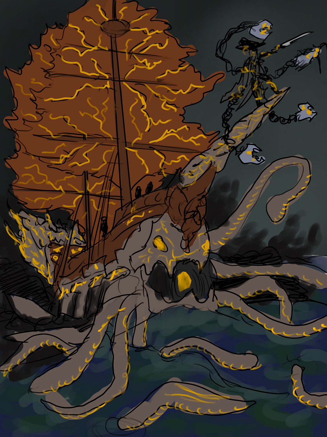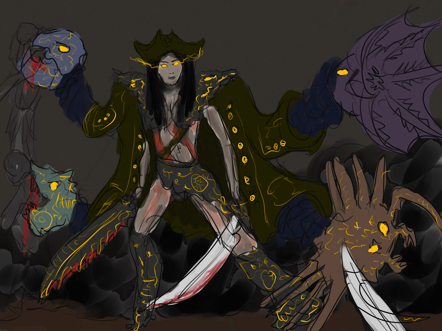 Merci beaucoup pour vos retours! 😄 @renardou_chetifwow merci c'est un très beau compliment! @digitalorymerci 😄 oui je suis assez d'accord, en sachant que là c'est juste le perso, dans l'idée il y aura dans sa main droite un bateau, voir peut être une scène d'affrontement naval un peu vaporeux dans les tons verdâtre, et des os voleront autour, je sais pas si c'est clair ahah. @fomwMerci pour ton retour, tu pourrais me dire ce que tu préférés dans la première illu? 🙂