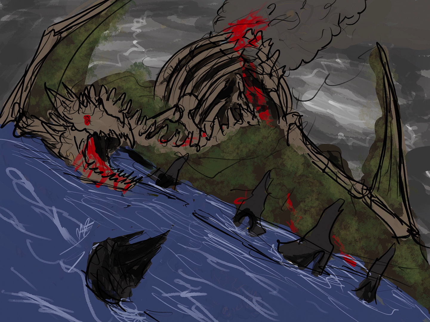 CE MOMENT 🤯🤯🤯 Je comprends tellement... (bien que je n'aie pas la partie dialogue interne 🤪) Toujours aussi cool ! Pour les conseils d'un camarade de galère : 1 - Je pense que tu as de la marge en termes d'accentuation des ombres/lumières ? 2 - Tu pourrais travailler davantage les textures : la membrane des ailes par exemple, ou même le "cuir" / écailles à certains endroits peut-être ? 3 - Je tilte à l'instant que j'ai parfois l'impression que certains des petits nuages au-dessus des bateaux sont posés sur l'eau ? (c'est peut-être que moi...) Bon courage ! (continue ! 😇)
