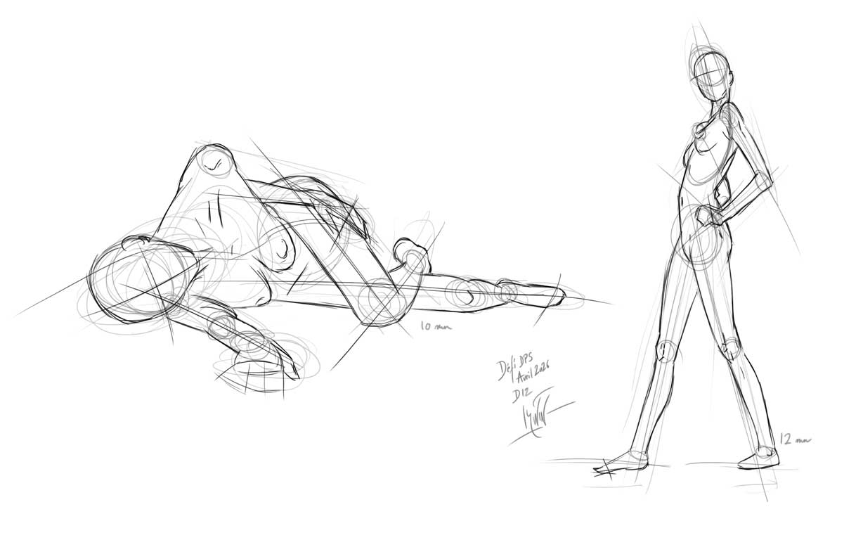 Bonsoir tout le monde ! J'ai quitté le niveau 1 et me voici... au niveau 2 pour l'exercice de gestuelle. Comment le dire simplement ? C'était un carnage 😂c'est la première fois que je fais un exercice avec un timer et moi qui met plusieurs minutes à faire 1 trait, qui le recommence parfois 30 fois et qui passe mon temps à zoomer dézoomer, j'ai du apprendre à capter l'essentiel rapidement et à le reproduire, sans gommer. Cette première session m'a fait rire en fait ! Les premières figures (à gauche) sont un fouillis paniqué de lignes 😂 après ça allait mieux je me suis détendue mais je n'ai pas eu le temps de finir les poses (le timer était sur 2 minutes pourtant 😶🌫️). Je continuerai sur le niveau 2 demain ! En tout cas, c'est très difficile ! Belle soirée ♥ -