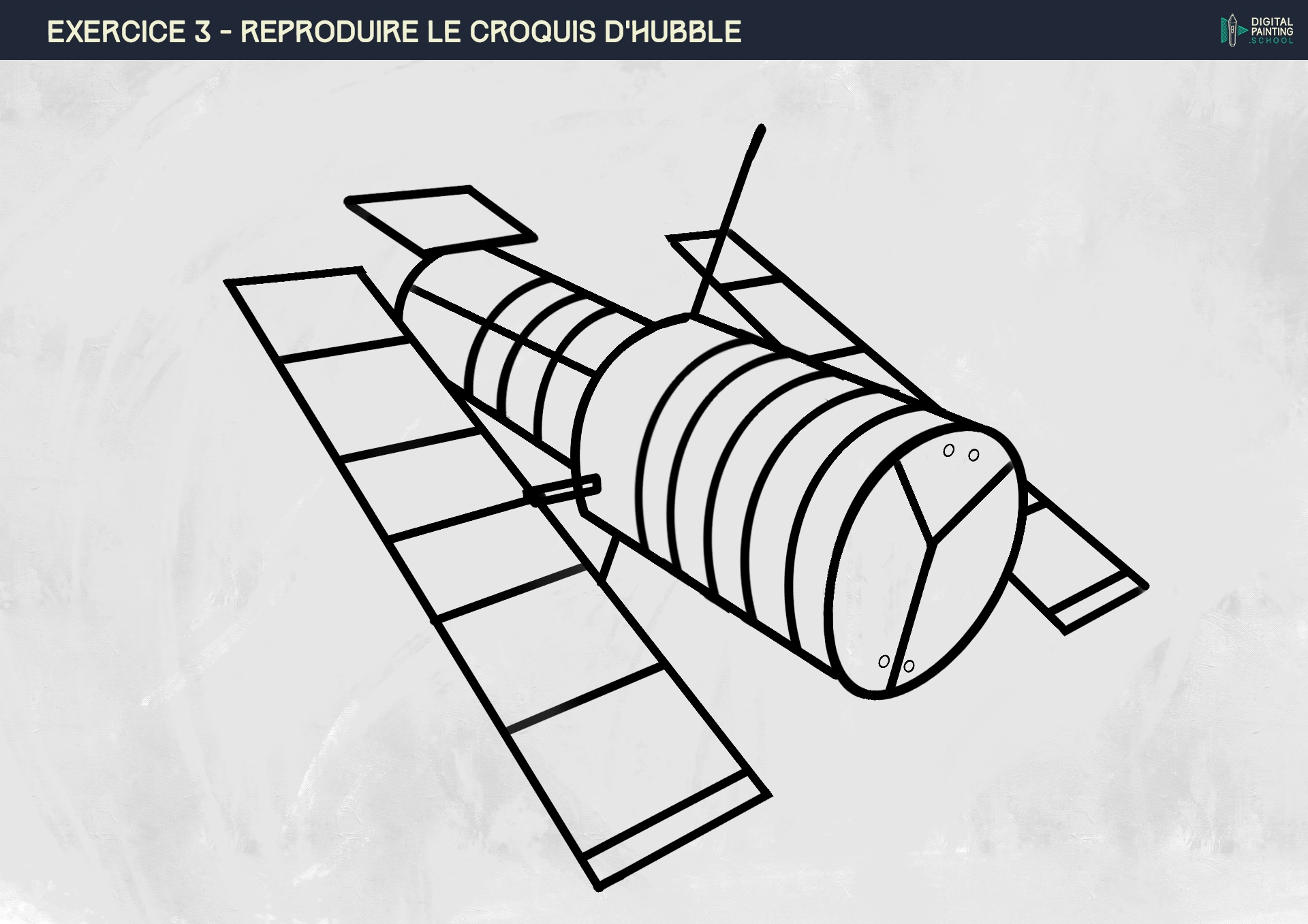 Bonjour à tous, Je viens de finir le croquis du hubble. J’ai vu que beaucoup d’autres élèves avaient coloré le croquis mais je ne l’ai pas fait. Non par flemme mais j’ai bien galéré sur le premier chapitre pendant des mois, j’essaie d’avancer un peu plus rapidement maintenant sans bâcler le travail bien sûr. Que pensez-vous du résultat ? La taille du brush est un peu épais mais je ne pense pas que ça ai grande importance pour cet exercice en particulier ?