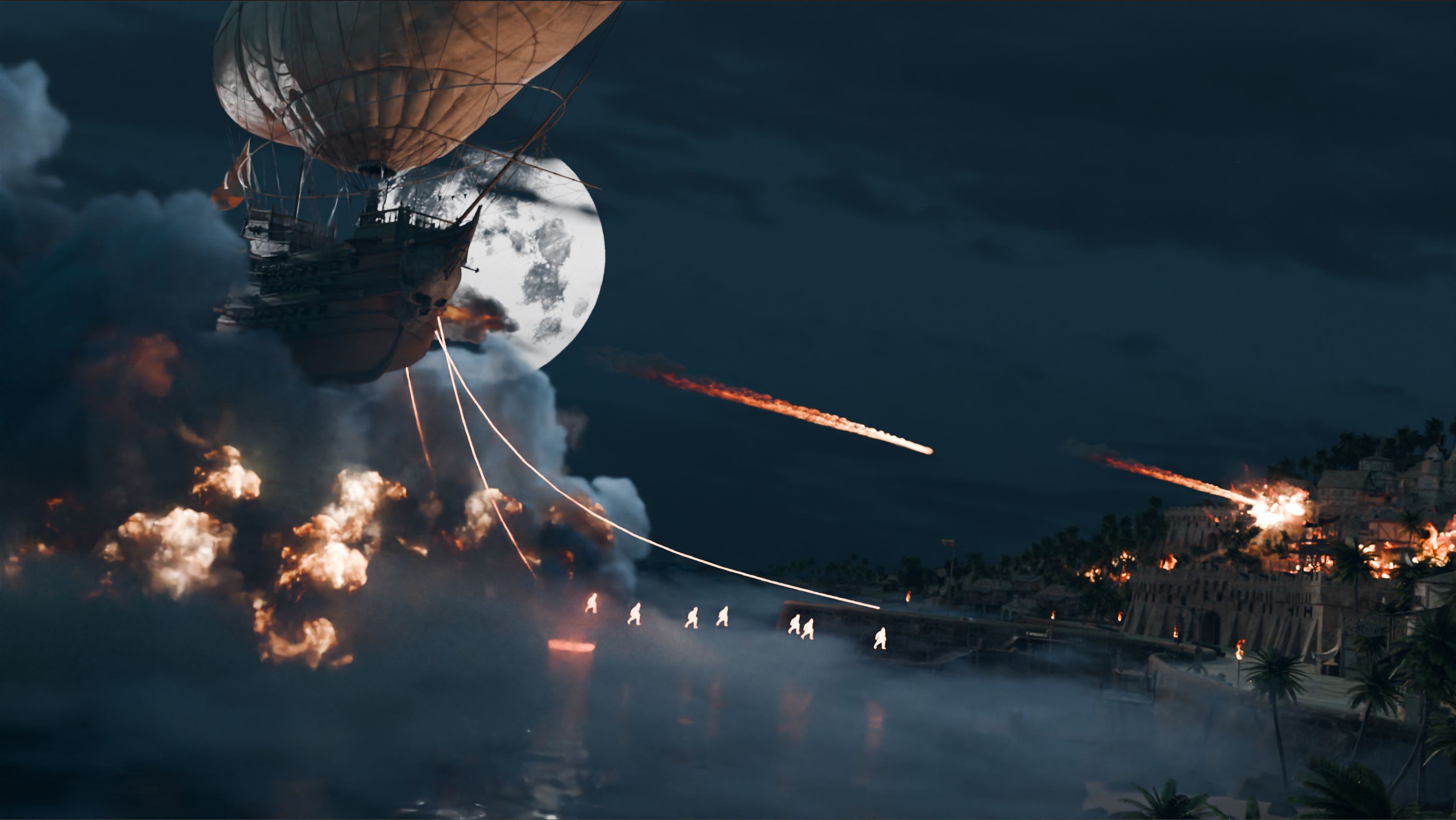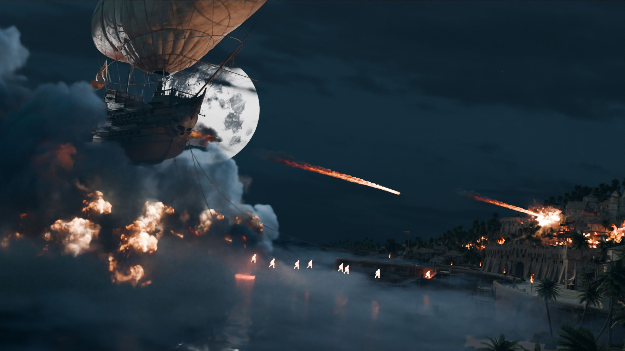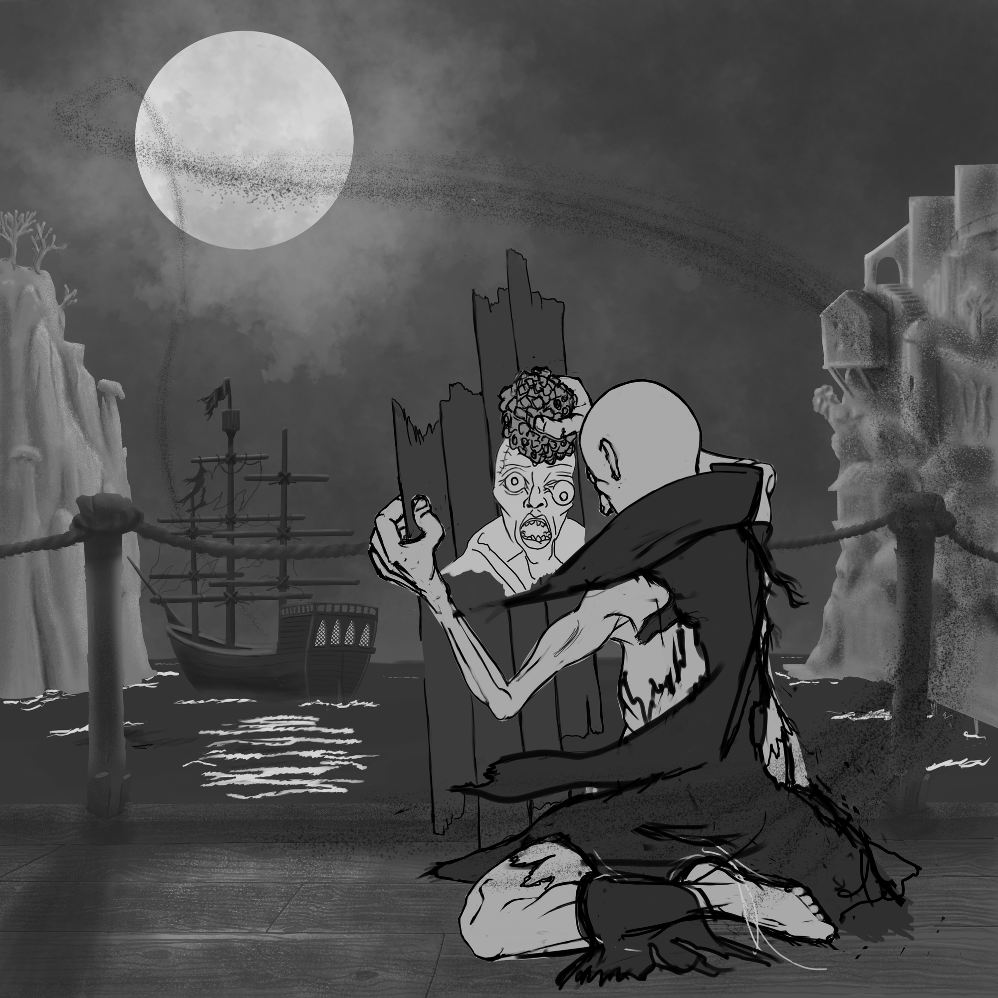 Bonjour ! Pour ce projet j'ai voulu représenter le Black Bones comme une marche funèbre. A l'image d'un Requiem, lorsque nous entendons approcher ce navire, nous ne le savons pas encore mais nous sommes déjà mort. J'ai voulu apporter cette touche musicale comme un grand Maestro qui joue avec les âmes de ses victimes c'est pourquoi j'ai voulu ajouter une orgue à l'arrière et rajouter des grands rideaux rouge pour rajouter un coté théâtral. Une fois le design validé, j'ai construit mon Navire en perspective puis je me suis décider sur un Paint assez réaliste avec le rajout des nombreuses victime de ce navire en légère transparence. je voulais les fondre avec la brume pour donner cette sensation au navire d'a la fois flotter sur ce brouillard mais également d'être porter par les malheureux qui ont croisé sa route