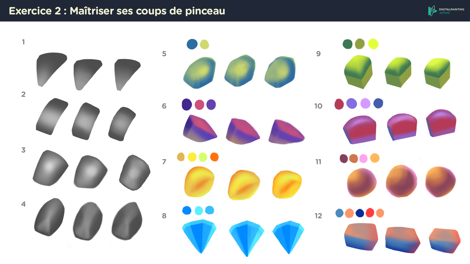 Après quelques mois d’inactivité où j’ai perdu confiance, j’ai réussi à m’y remettre en choisissant de reprendre de zéro (avec Procreate dans un premier temps pour ensuite revenir sur Photoshop plus tard). Voici donc l’exo des formes où je n’arrive pas à expliquer pourquoi mais j’ai vraiment galéré à obtenir un résultat correct par rapport à la première fois où je l’ai fait avec Photoshop sur laquelle je trouvais m’être plutôt bien débrouillé. Sûrement le temps de m’adapter au brush correctement. Et je mets aussi également l’exercice avec le personnage dans un milieu enneigé où là par contre j’ai vraiment senti commencer à réussir plus ou moins à me servir des brushs. N’hésitez pas à me dire ce que vous en pensez et je vous en remercie d’avance