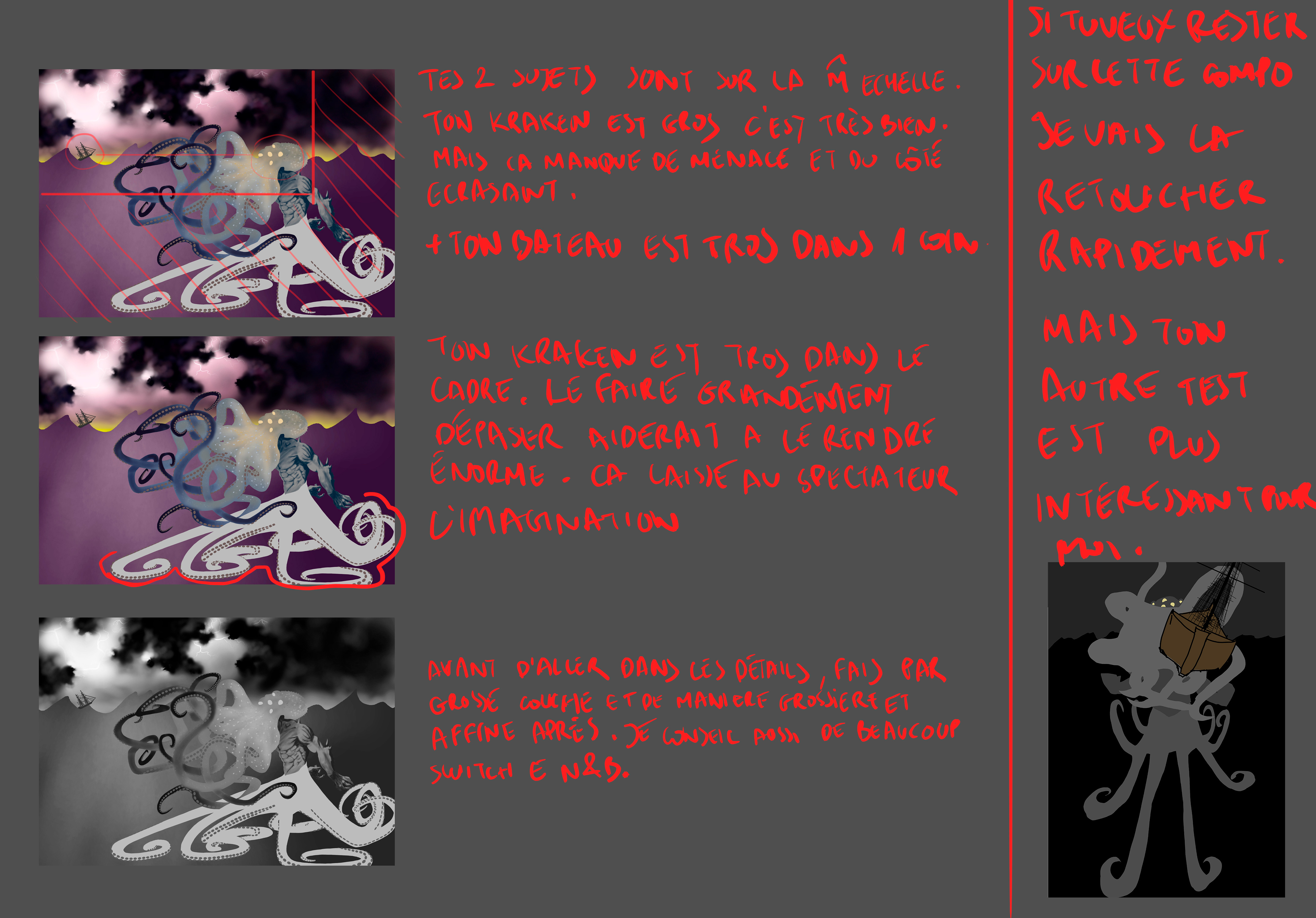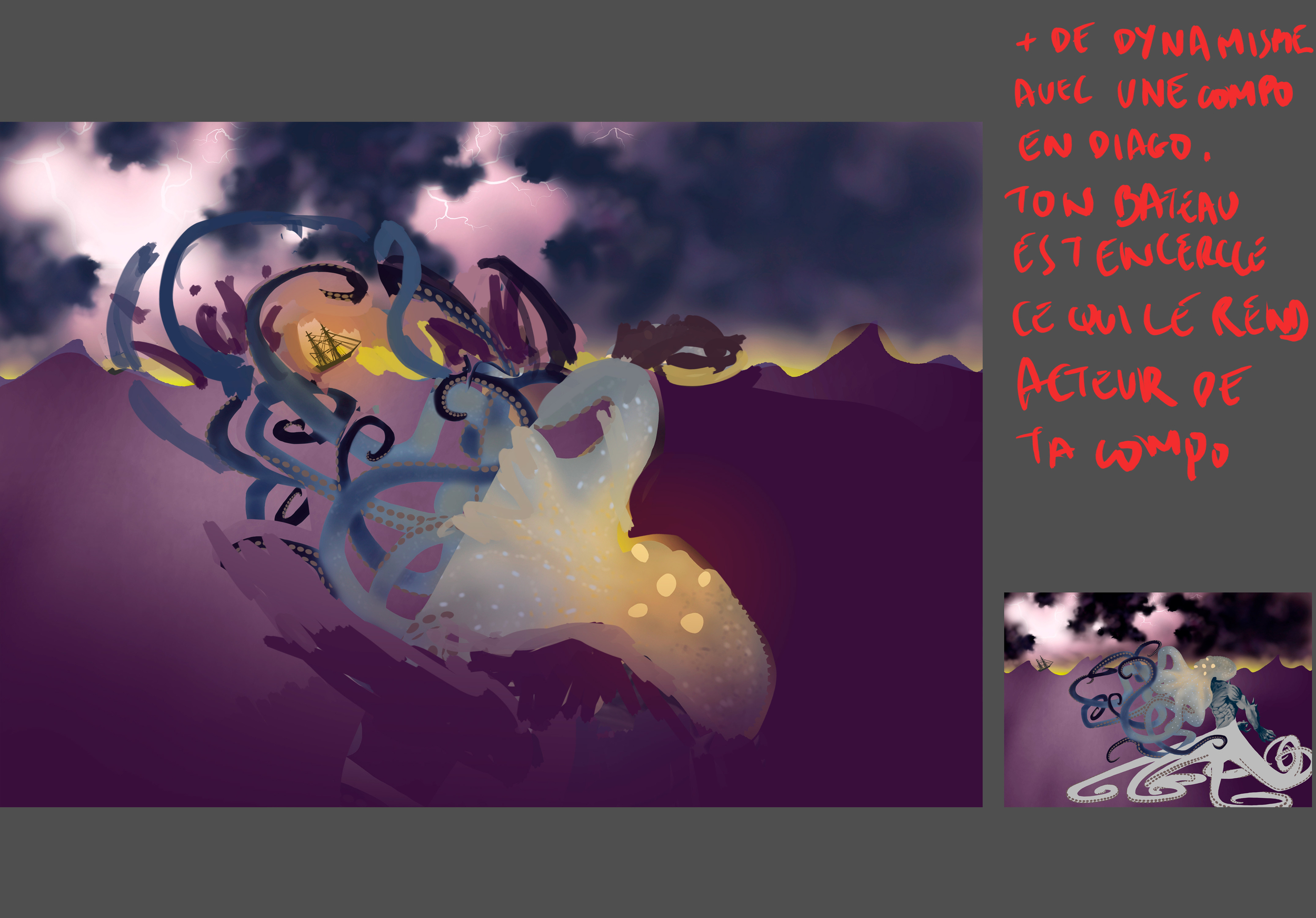 Bonjour, je trouve les 2 compo sympas par contre la première répond plus à la demande, dans la 2e les ossements n apparaissent pas mais je ne suis pas pro donc peut être qu on n est pas obligé de mettre tout les détails dans l illustration. Je suis partie sur cette île aussi, c est sympas de voir d autre interprétation. Le côté tempête est bien réussi sur la 2 e illu, pour la première en fonction des éléments de paysage que tu choisies tu pourras faire le bucolique ou la tempête. Hâtes de voir ta progression -