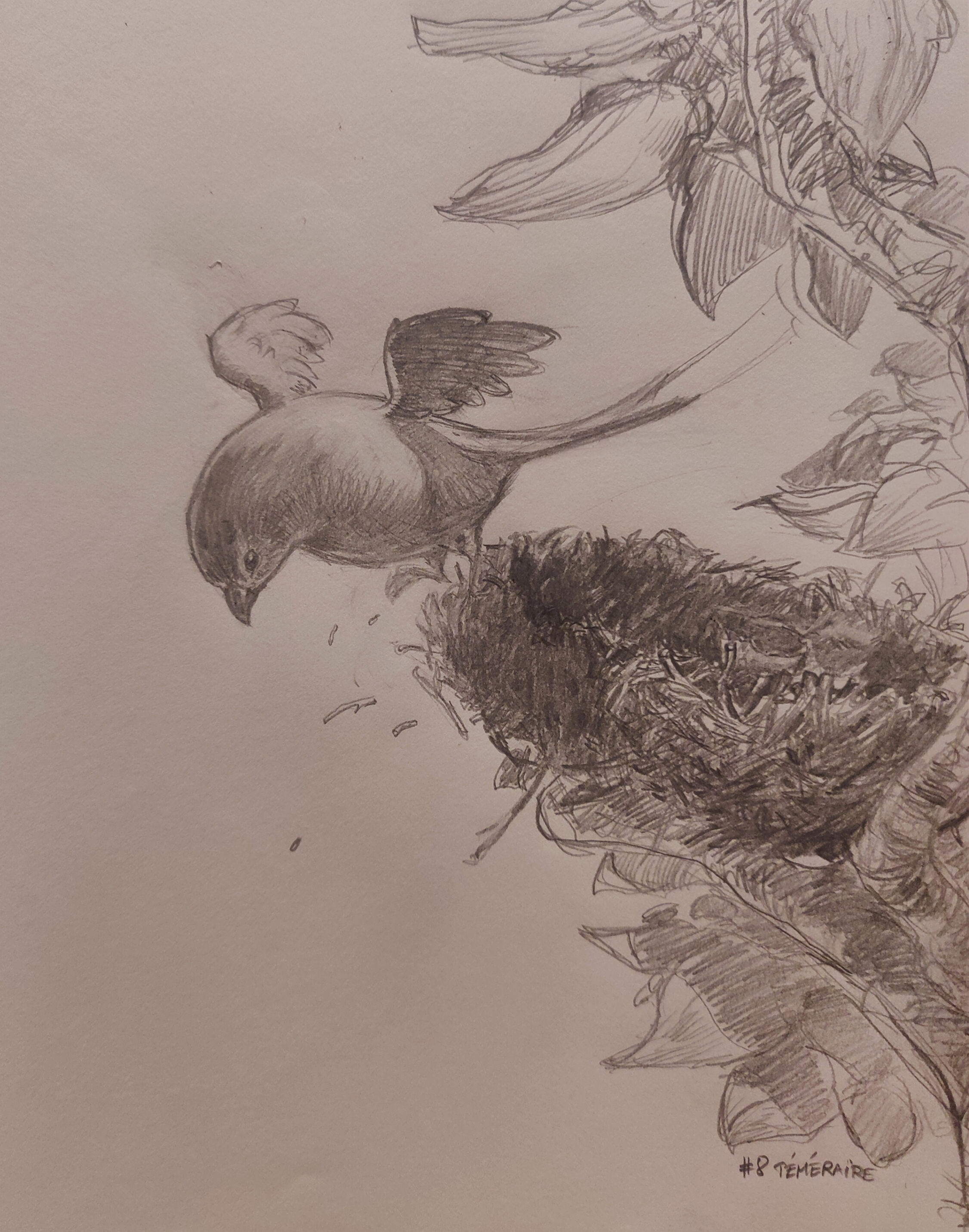 Bonsoir tout le monde ! Allez, ce soir, soyons fou, je suis téméraire, j'essaie de faire des commentaires ! @shelter J'aime beaucoup le petit univers et l'ambiance de tes Noctils, simple et onirique, ça donne envie de voir ce qui va leur arriver dans la suite du mois ! Peut-être essayer avec un brush plus fin de faire des highlights à certain endroit pour booster les parties importantes… @apostroke Ton style et tes lignes sont folles, ça met vraiment dans l'ambiance octobre et donne aussi envie de voir comment tu vas réussir à traiter chaque mot, l'étoile de mer était vraiment bien détournée c'est cool ! @julie l La pose et les lumière fait bien dynamique, manque que la bave de la créature pour donner un frisson… @daff Je trouve que le style simple rend super bien ici, ambiance désertique avec un soleil aride, la corde qui vient vers nous plonge bien dans l'illustration, à presque en avoir le vertige. Une pose plus tendue aurait peut-être mis plus l'accent sur l'émotion… @flockon Les traits sont si brutes et si efficace c'est fou, le trait gris pâle à la limite du sol me perturbe un peu, mais le personnage est de mon point de vue impressionnant ! @tolokoban Très sympa la petite scénette ! J'y verrai presque dans une cinématique, avec un peu plus de finition… @gopperus Le chat fait peur et le choix des couleurs est aussi téméraire que la souris est insolente ! @ Diamones Tes croquis depuis le début me donnerait envie de me remettre au coloriage, c'est très chouette et le fil conducteur entre… ce serait parfait pour un livre de coloriage je pense justement, avec une minie histoire ! @stefou Ton style est tellement incroyable, la texture rend les images déjà mignonne de part le design comme.. douces. Les couleurs, les lumières, les mini histoires, j'aime trop ! @goot J'aime beaucoup la compo et la mini histoire, le bout arrière du verre de terre me perturbe un peu mais l'expression de la souris est bien réussi je trouve ! @etiennaze Ambiance très chouette, ça me donne envie de voir ce que ça donnerait avec plus de détails, sur le monstre et tout @yurinamai J'aime trop tes petites souris et leur petite histoire, jolie coup de crayon/stylet, hâte de voir ce qui va bien pouvoir leur arriver ! @deny J'aime beaucoup ton coup de crayon tout "rond" et la maîtrise du dessin au crayon, c'est impressionnant je trouve ! @haeresis Pas sûr d'avoir la référence, maiss le trait à la dynamique de la jeunesse ça m'impressionne cette maîtrise ! @oknim7 Je dois avouer que tes croquis font partie de ceux que j'attend maintenant, c'est clean, drôle et avec comme une histoire derrière, top ! Pour ma part j'ai testé quelque chose que je n'ai jamais trop fait avec les hachures... Le niveau de certains ici en dessin crayonné donne envie d'essayer de progresser !