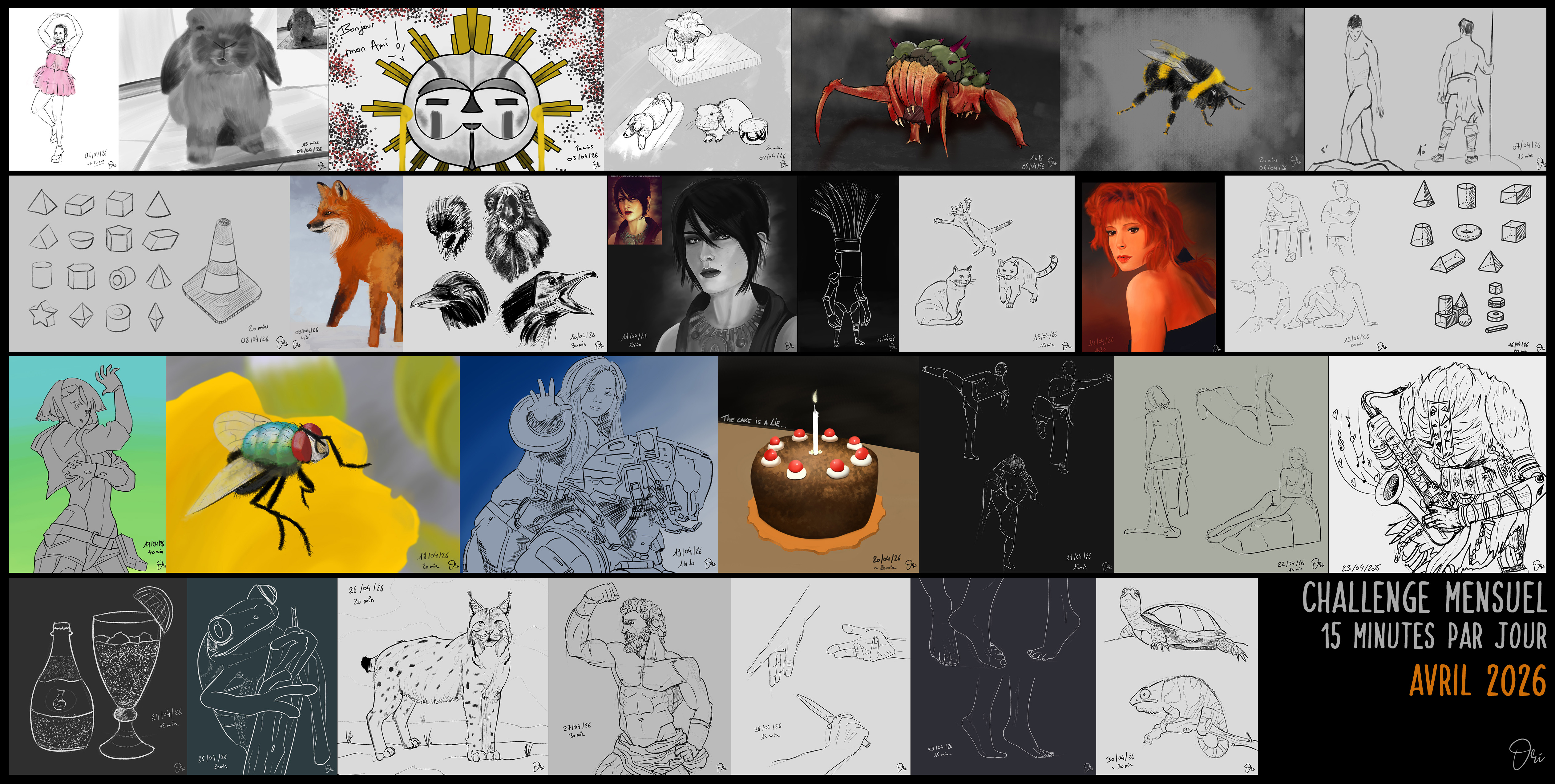 45' de plus (pour 3h00 au final, montré avec la référence) pour terminer ce challenge 🙂 : Le bilan est très positif pour moi : je suis content d'avoir réussi à m'y tenir et je mets aussi ci-dessous une petite fresque avec toutes mes petites réalisations du mois : Ce sera sans doute plus difficile pour moi d'être aussi régulier pendant le mois de mai à cause des ponts et week-end où je vais bouger mais je vais quand même tenter de continuer un peu sur ma lancée 🙂. Un grand merci pour ce challenge et bravo à tous ça m'a bien motivé de voir tout le monde jouer le jeu. - Hier