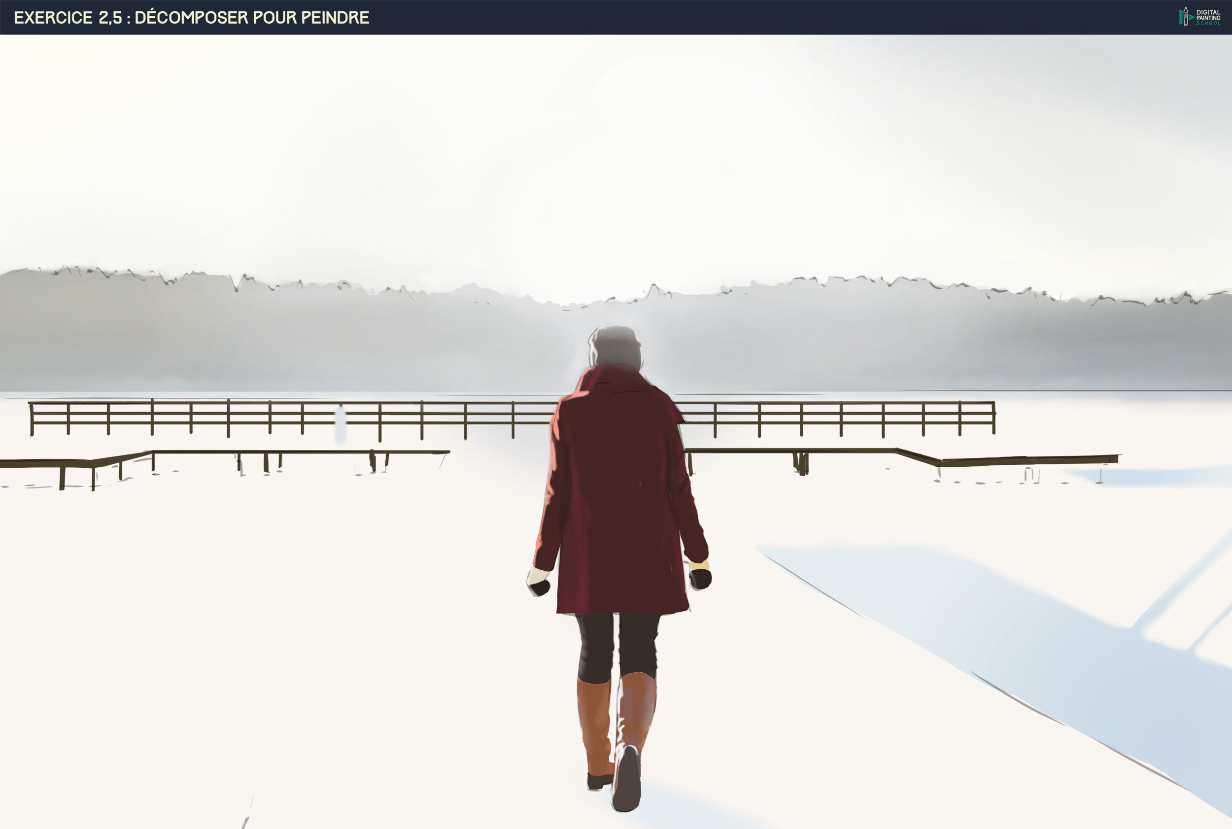 Hello @Ipomete ! Wow bravo ! C'est ultra solide ! Bravo pour tes corrections ! Pour le petit doigt je sais pas trop quoi te dire. J'ai jamais eu de tendinite en dessinant et c'est mieux d'avoir des vrais retours d'un doc plutôt que d'un formateur là dessus. Pour moi tu peux passer à autre chose si t'en as marre. Le gros de l'exo à été fait. Après si tu veux aller plus loin on peut clean les barrières et poutre du second plan qui sont un poil trop à l'arrache comparé à ton perso. Il faudrait juste clean/rigidifier les silhouettes. Aussi les coups de brush sur la neige font un peut tâches à coté également maintenant mais itsok. Beau travail ! Bon courage pour la suite !