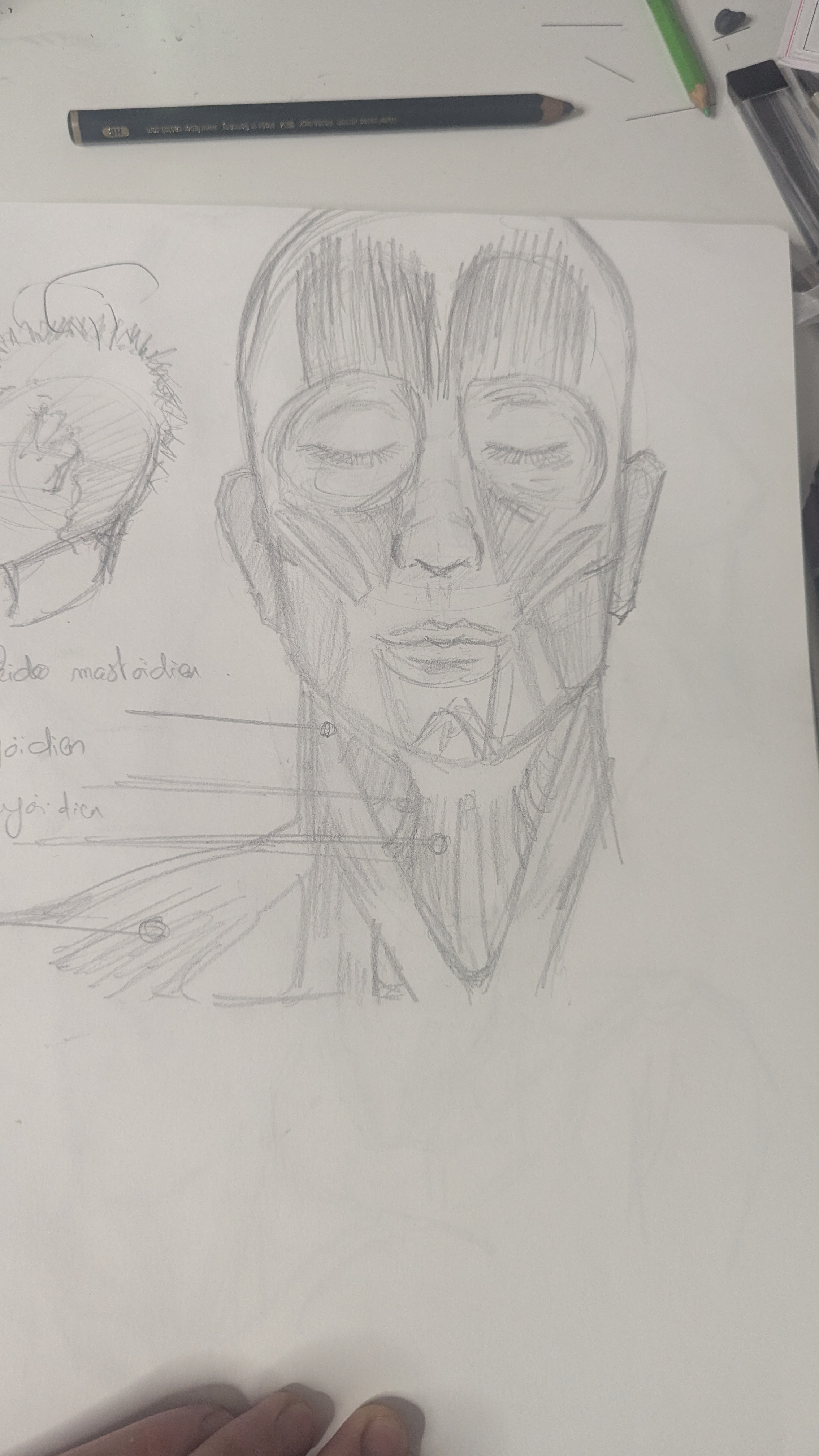 Hello à tous, voilà un premier visage, qui ne ressemble pas trop à la ref, l'angle de vue est pas évident 😅 et j'ai essayé de repérer les différents muscle du visage mais pas sûr que ce soit très précis haha. -