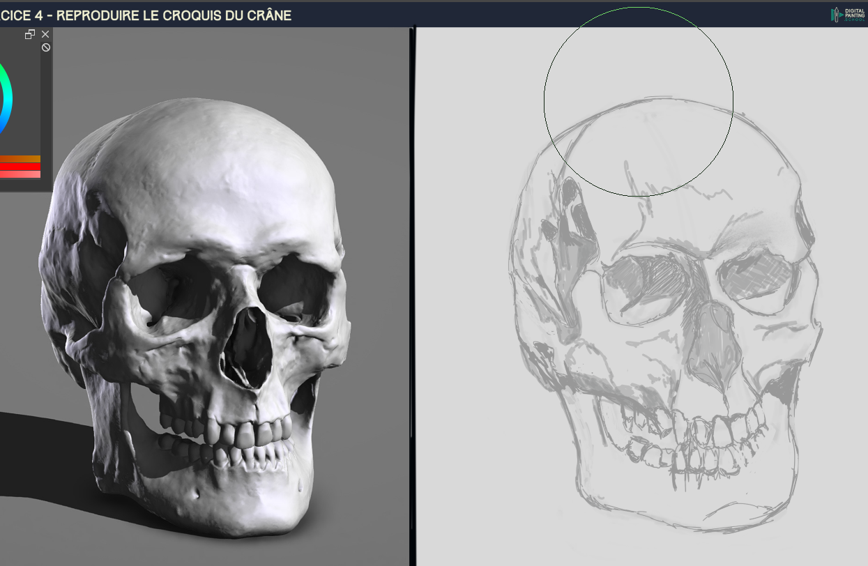 Salut @Lephenix, Je vois 👍 Du coup, ici, les 2 principaux problèmes qu'il y a sur ton crane sont : - ton crane est globalement "pas droit" dans le sens où on a l'impression que tu lui a fait faire une rotation trop importante sur la gauche. - Attention également au bon alignement de la dentition et de la machoire. Sur la droite, on n'est pas censé retrouver un aussi fort arrondi qui remonte. - Attention aussi aux proportions des dents qui sont trop grosses ici. Je te laisse corriger ça. N'hésite pas, si tu galères trop à faire les corrections, à superposer de temps en temps la réf à ton croquis pour mieux visualiser les différents écarts 👍