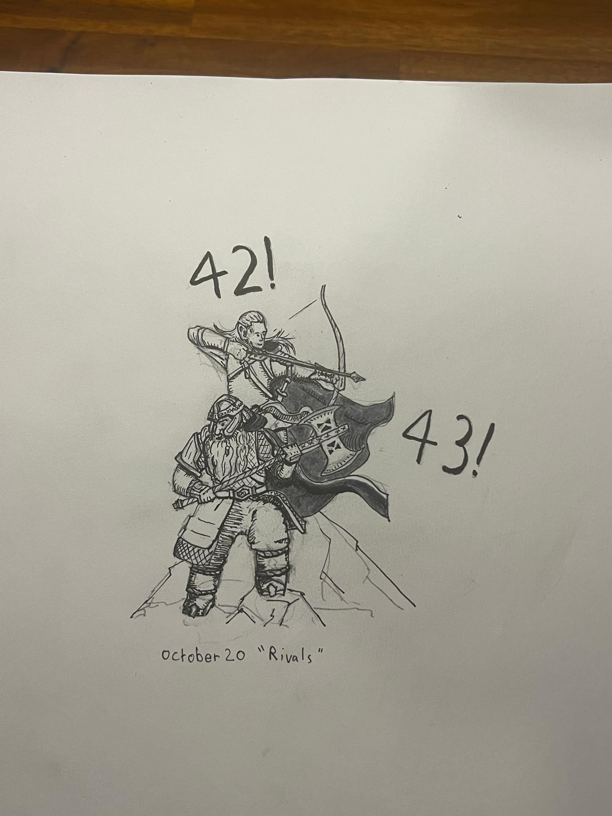 Yes! C’était ma première participation et j’ai tenu bon! Certains jours étaient plus rudes que d’autres, mais j’ai fini par tous les faire. Une fois arrivé au 11 jour, sting, m'as fait pencher du coté de LOTR pour l'inspiration pour les suivants. 🙂 J’ai mis en pièces jointes mes dessins dont je suis la plus fière. Tout particulierement content de comment le roi de l'armée des morts est sorti! -