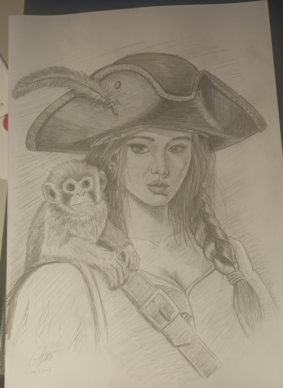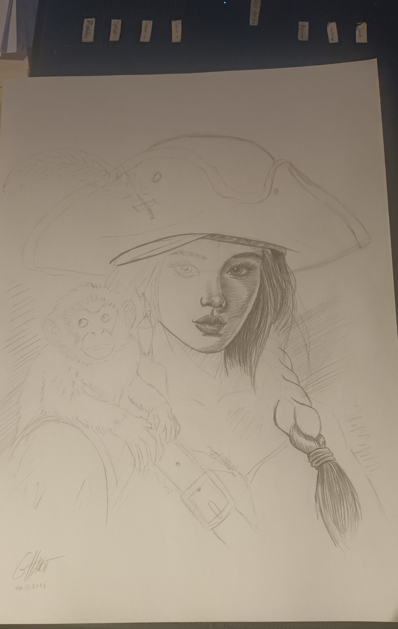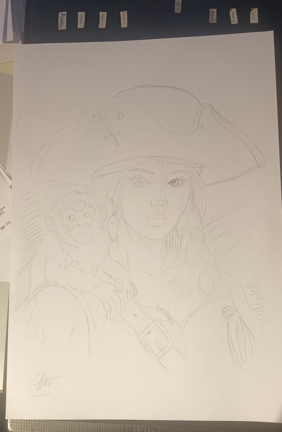 20. Ça n'a pas été facile mais je suis content d'avoir pu terminer à temps. Le défit à été relevé !! Finalement, j'ai fait un décor sur des rochers plutôt que sur le bateau lui-même avec des scènes de bataille à l'arrière plan, je trouve que ça le met plus en valeur. Mon décor initial était trop charger en détails, d'ailleurs, même les canons étaient prévus avec plus de gravures ce qui enlevait de l'attention au personnage et déservait plus l'image qu'autre chose. Il s'avance vers le spectateur, sûr de lui, le pas lourd, avec un sourire qui en dit long sur le personnage. Le navire vient de s'écraser sur les rochers et il s'avance vers sa dernière victime. Je l'ai fait dans des conditions particulières, enfants présents et actifs en permanence, sans mon ateliers tout équipé, sans mes affaires habituelles, avec une tablette que j'ai dû commander et qui à mis une vingtaine de jours à arriver à destinantion, mais j'ai essayé de répondre au mieux au brief qui était imposé, un exercice que j'ai beaucoup apprécié. Il était difficile pour moi de ne pas participer vu le sujet qui est la piraterie, un sujet que j'apprécie beaucoup. Voilà donc le résultat de deux mois acharnés où j'ai travaillé sur un très grand format pour pouvoir y aller par petites touches précises pour avoir ce rendu réaliste que j'aime bien faire. j'espère que vous l'apprécierez, je pense avoir atteind mon objectif initial, merci à vous pour ce challenge !