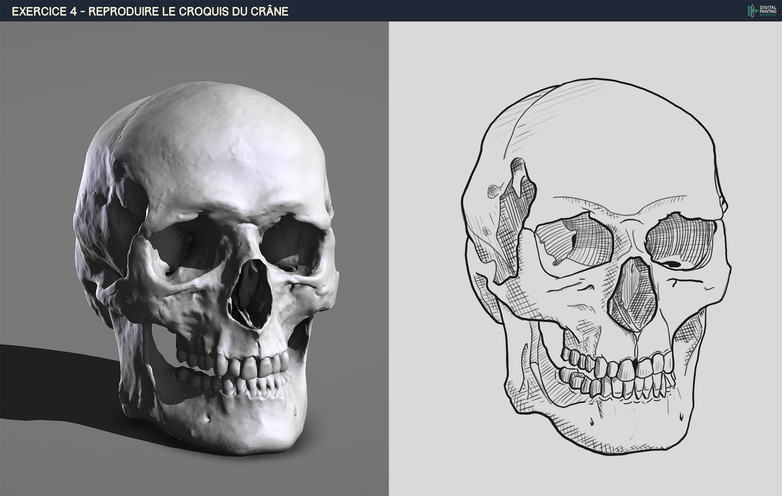 Après une pause pendant laquelle j'ai réalisé un dessin perso et pendant laquelle je me suis relancé des douleurs à l'épaule et au trapèze, j'ai quand même réussi à me remettre sur les exercices. Ça m’embêterait beaucoup d'être obligé d’arrêter. Mais, il va falloir que je me ménage. Bref, voici l'exercice du crâne. J'ai suivi le processus. Je ne mets ici que le résultat final mais s'il le faut, je dois pouvoir poster les différentes étapes.