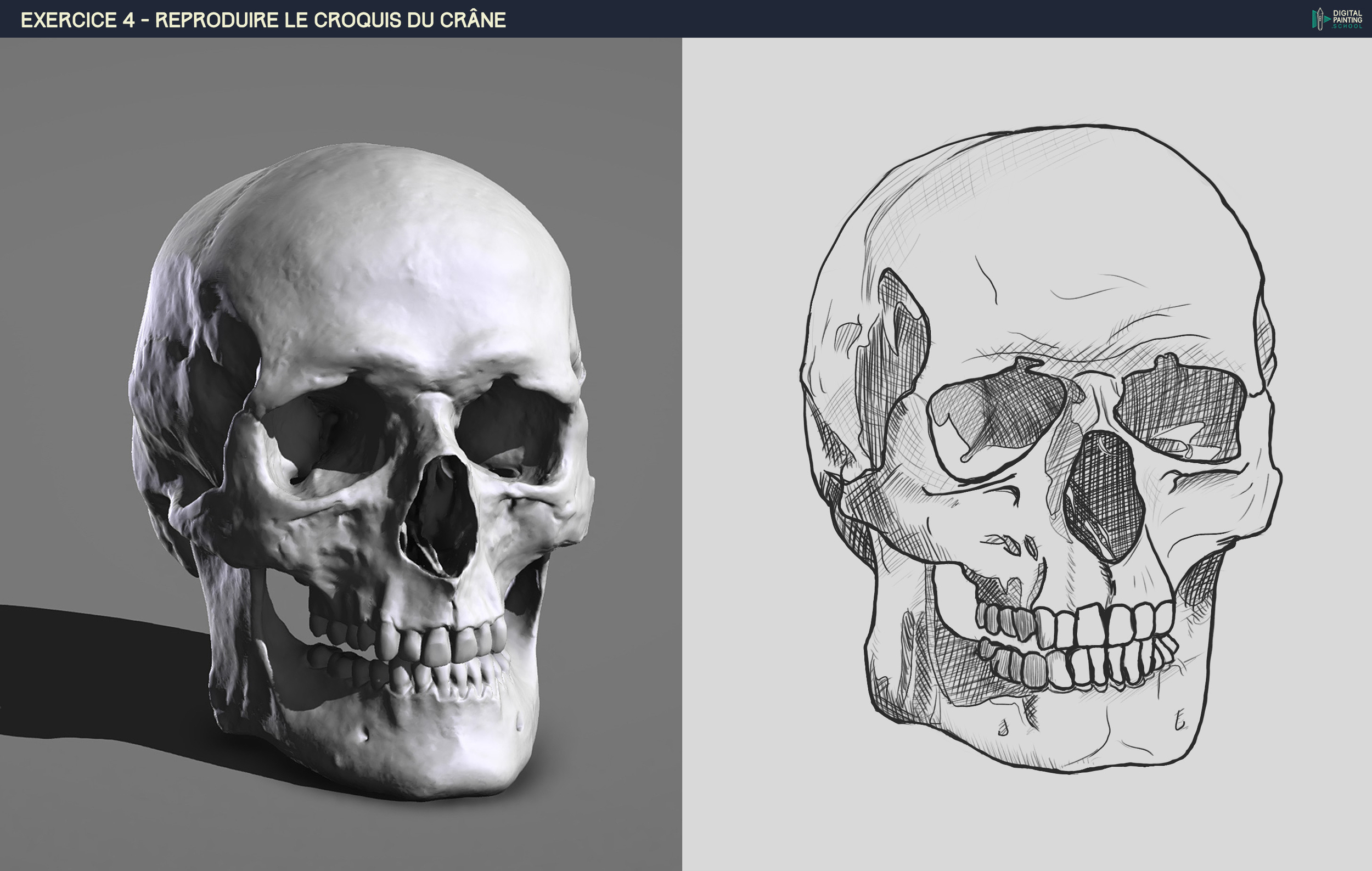 Salut @Phoenix, En termes de ressemblance , de proportions, etc.. ton crâne est globalement très bien réussi. Bien joué ! 👍 Pour chipoter éventuellement, je dirais que l'alignement des orbites est un poil trop penché vers la gauche et les dents sont un peu trop petites. En parallèle, le point qui serait prioritaire à corriger, c'est la finition de ta ligne qui, pour le moment est encore trop brouillonne et inconsistante à différents endroits pour avoir réellement un rendu "fini" : Essaye d'avoir une meilleure continuité là où ton épaisseur change aussi drastiquement. Marque mieux également la ligne des éléments importants (ex : cavité nasale qui ne ressort pas du tout sur le côté gauche). Bonne continuation !