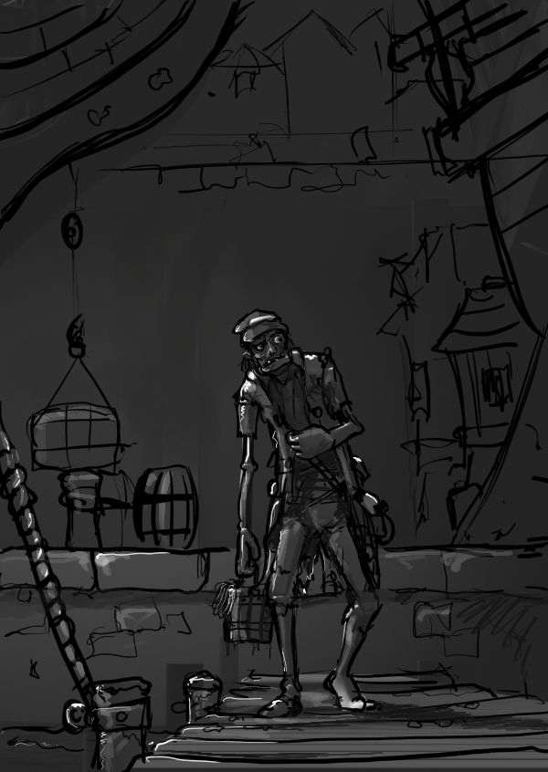 Salut! le personnage est cool. J'aurais une remarque pour la mise en peinture: Ton étape d'overpaint est vraiment bien. Après tu as tout contrasté avec du noir et mis des textures partout et cela aplatit ton image. Ce n'est pas en ajoutant des détails partout que ton image va être mieux. Je te conseillerais de passer en noir et blanc pour gérer ce problème. Tes contrastes et saturations les plus fortes doivent être sur le point focal de ton image. Ensuite, au lieu de partir sur du noir pour faire tes ombres, utilise plutôt une couleur complémentaire. Aussi ,j'ai remarqué que tes ombres et lumières ne sont pas cohérents dans ton décor. Voici un po vite fait pour t'expliquer. J'espère que cela t'aidera. -