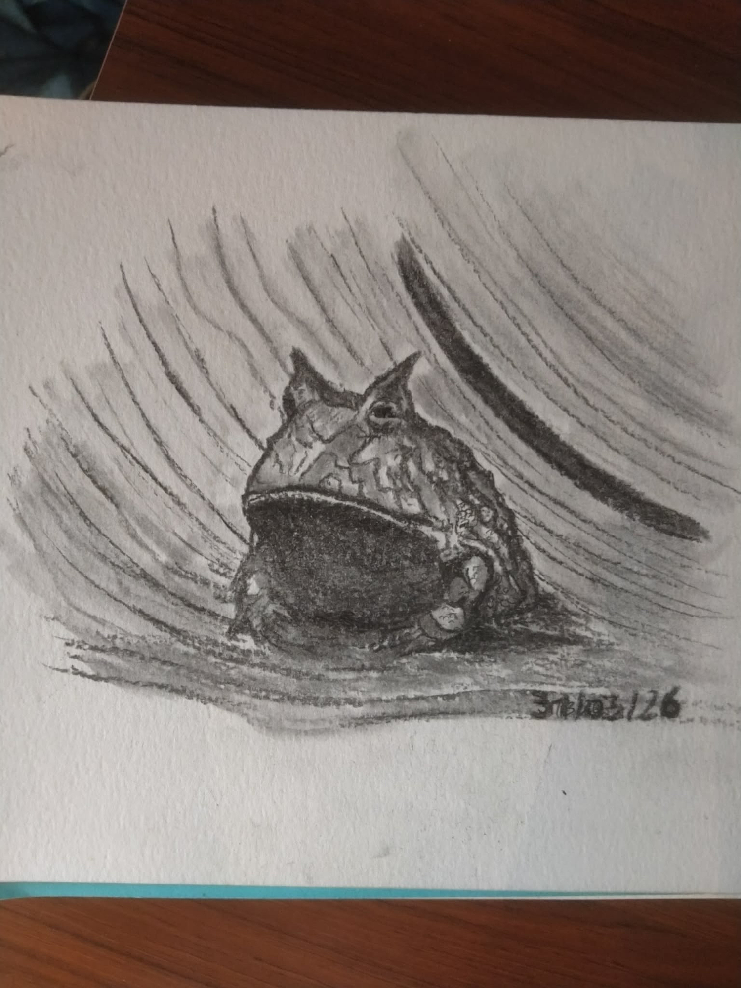 Pour ma part je commence avec un petit crapaud, animal que j’affectionne particulièrement 😆 @starman m’a donné envie de ressortir des fusains 😉 je trouve ça chouette comme médium pour croquer. Par contre je suis un peu deg le produit fixant a fait baver le dessin 😕 (Je posterai souvent celui de la « veille » parce que je m’endors sur mon dessin ou je finis après minuit et pas l'énergie de poster aussi tard…) -