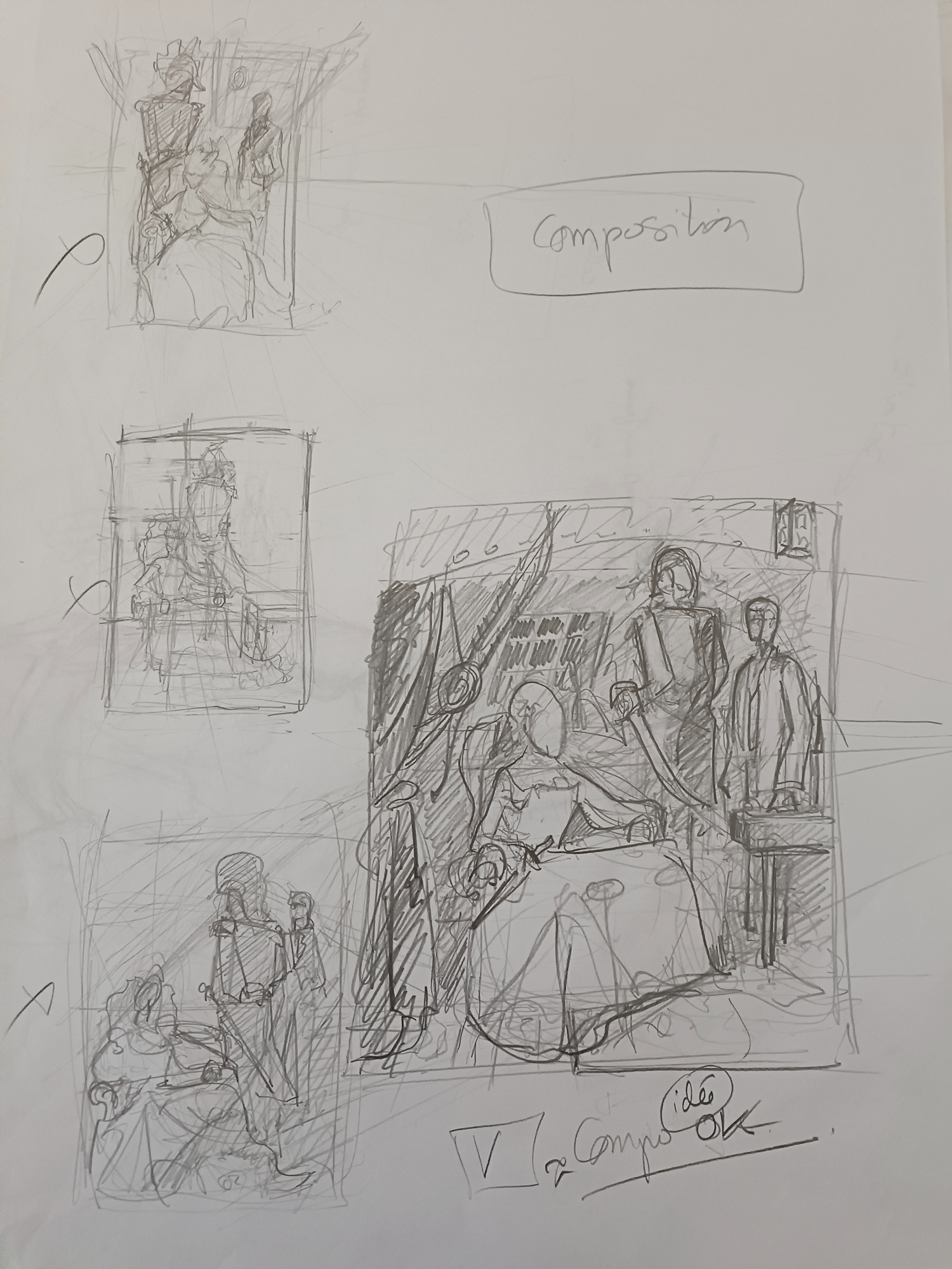 Bonjour à tous ! Alors en préambule : Merci encore aux organisateurs d'autoriser les médium traditionnels. Je participerai donc avec du papier qui peluche au gommage, un crayon qui salit, de l'encre qui tâche et de l'aquarelle qui ne fait que ce qu'elle veut. Bravo aux participations déjà postées ou en wip, il y en a de nombreuses qui sont à faire bouter les yeux hors de leurs orbites. Ma participation sera plus humble, classique et en mode réaliste. Alors c'est parti ! Mon premier coup de cœur fut pour Katryna. Mais au fur et à mesure j'ai évolué et je me suis fait plaisir en faisant une composition de 3 persos "Coeurs Brûlants" dans un environnement. Un tantinet hors sujet mais tant pis, je vous dis tout. D'après le brief de Katryna , je voyais une superbe robe, du dynamisme, de l'espièglerie et un léger détail sanguinolent pour donner toute la mesure de sa détermination. Ci-dessous quelques études de compo, valeurs couleurs et du drapé. - Aujourd'hui