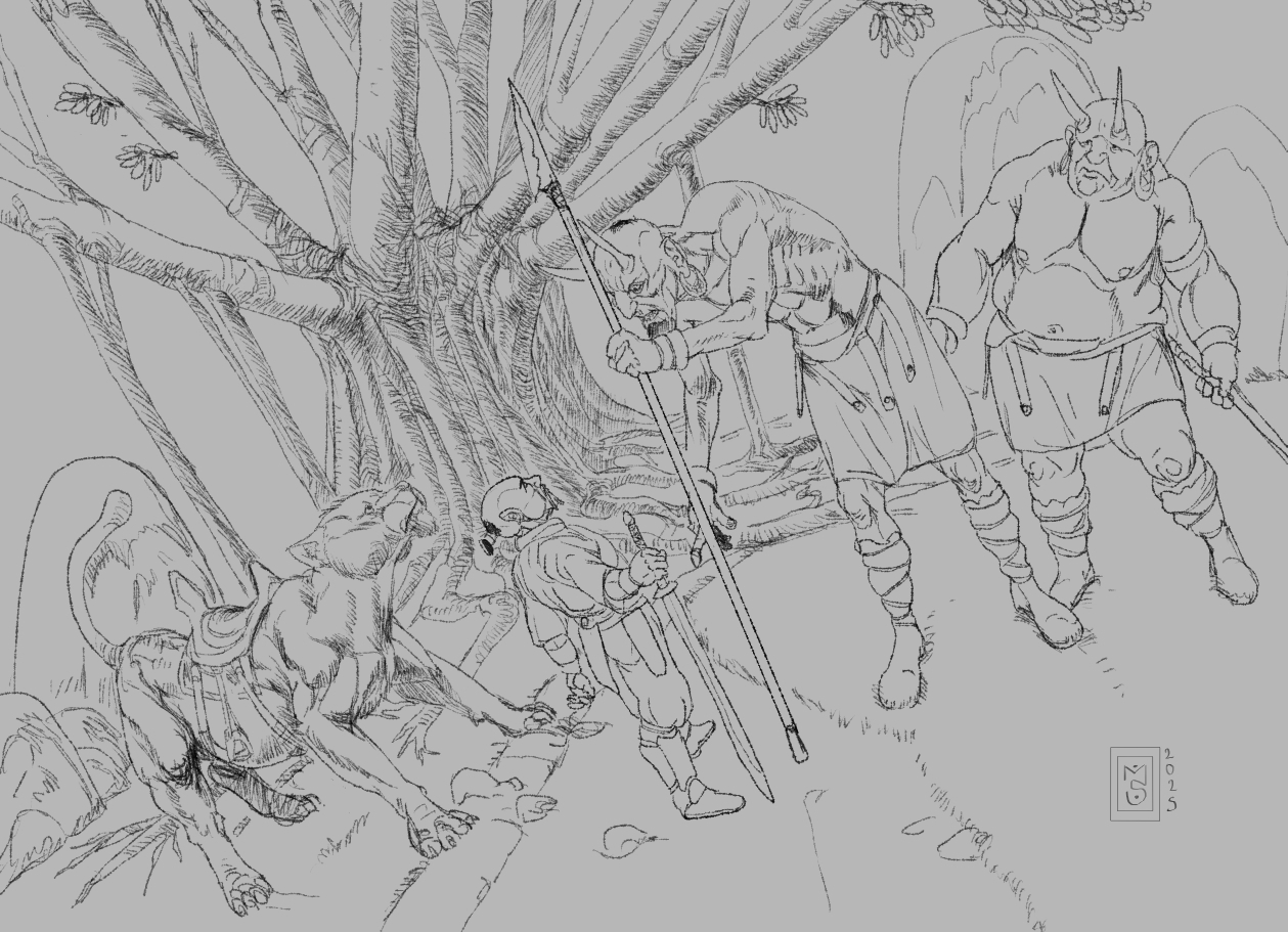 J'aime beaucoup ton illus. Ne lâche rien. Je suis d'accord avec @Bastien CH pour élargir un peu ton dessin pour "respirer" un peu plus et je jouerai sur la perspective atmosphérique pour éloigner les deux personnages du fond et ainsi faire ressortir ton personnage. En plus ton soleil étant très bas c'est dommage qu'il n'y ait pas plus de lumière chaude rasante. Tu pourrais ainsi à l'opposé mettre un peu plus de bleu pour faire un contraste et faire encore ressortir ton perso. C'est beaucoup d'info alors je t'ai fait un PO à l'arrache pour que tu comprennes mieux.