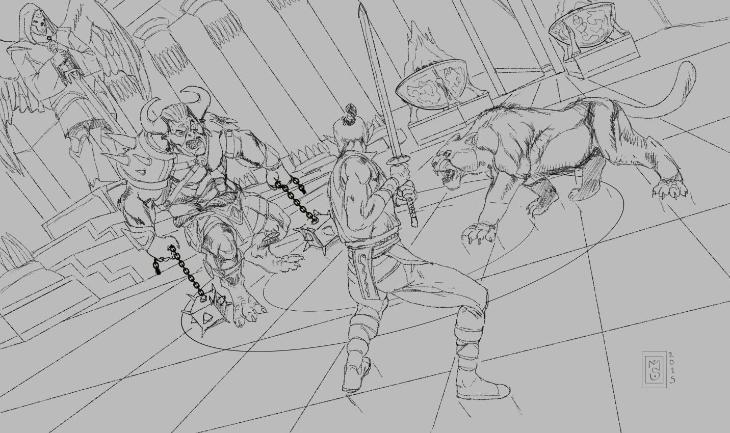 Idée ambitieuse en l'état, avec la perspective. L'indication de lumière met bien en valeur le personnage. Hâte de voir la future version, avec quelques cours pour enrichir tout ça ! -