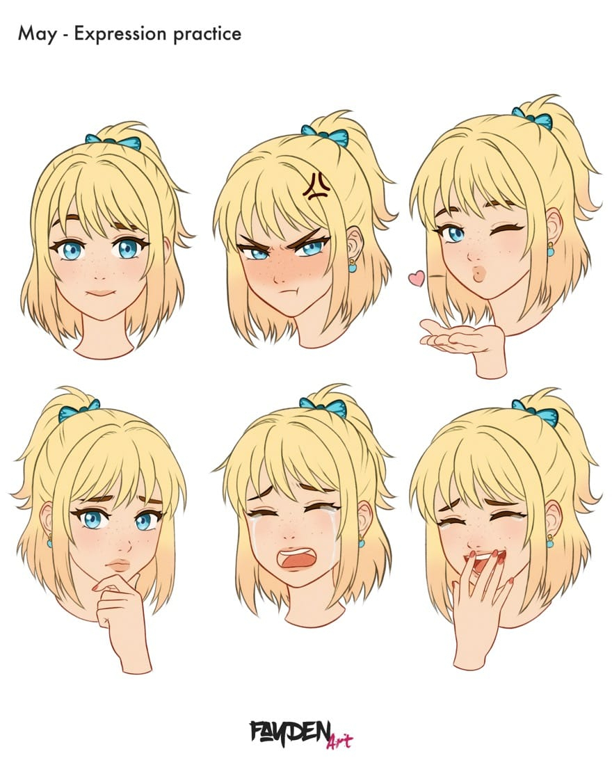 Je vous partage mes expression sheets de mes 2 personnages May et Dina que je dessinerait beaucoup cette année. J'ai pratiquer un peu ces derniers mois les expressions du visage grâce à des bouquins (Drawing facial expressions éditions tuttle , Human head anatomy "3D total") et des photos sur Pinterest.
