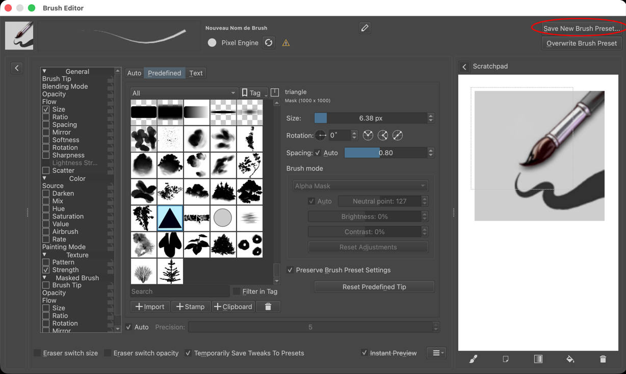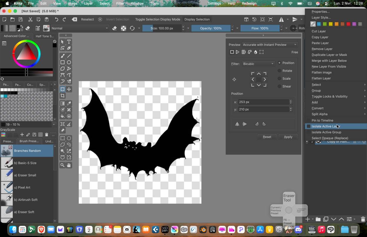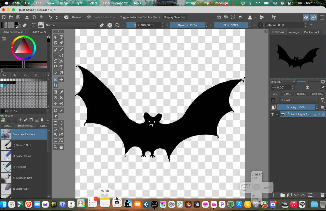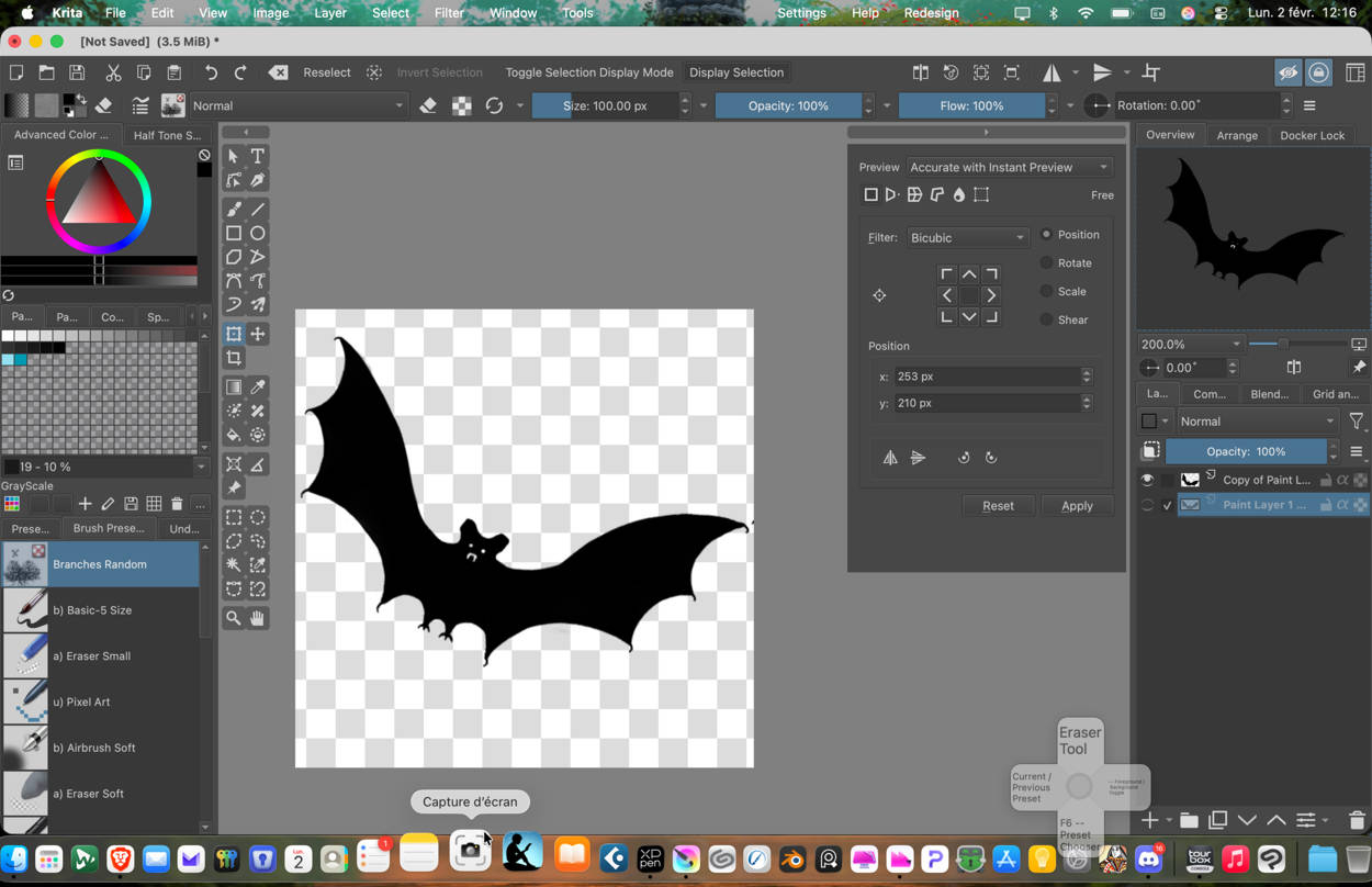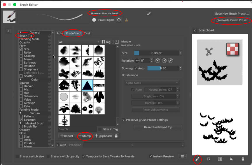 10. Bonjour à tous, Dans l'exercice 3 du chapitre 8, il est demandé de créer son propre custom brush pour faire une nuée de chauve-souris. Je vous fais un petit how-to : Dans Krita, les brushes avec plusieurs formes sont appelées "brush animé" et sont construites comme suit : Créer une nouvelle image d'environ 500x500 px 1) Sur un 1er calque dessinez la 1ère forme en noir pur ou en niveaux de gris à 100 % d'opacité (sauf si vous voulez des effets de transparence, auquel cas vous pouvez jouer sur l'opacité, mais sans changer la couleur), puis supprimez le calque de fond blanc. 2) Créez un nouveau calque par dessus le premier et dessinez la deuxième forme de la même façon que précédemment (vous pouvez masquer le calque précédent si il vous gêne). 3) Continuer le processus jusqu'à avoir toutes tes formes chacune sur un calque séparé. 4) Une fois que c'est fait, réafficher les calques masqués, puis faire un click droit sur la vignette du 1er calque dans la pile de calque et choisir l'option "isoler le calque". Répéter cette opération pour chaque calque. 5) Ouvrir l'éditeur de brush (F5), CLIQUER SUR SAVE NEW BRUSH PRESET en haut à droite pour faire une copie du brush que vous allez modifier. Une nouvelle fenêtre s'ouvre dans laquelle vous pouvez donner un nom à votre nouveau brush, choisir une icône différente pour le retrouver plus facilement (facultatif). Une fois terminé, cliquer sur Save. La fenêtre se ferme et vous devez normalement être sur ce nouveau brush, lequel est pour l'instant une simple copie du brush existant. 6) Maintenant on va modifier cette copie.. Ouvrez à nouveau l'éditeur de brush avec F5. Vérifier que le nom du brush est bien le bon (dans cet exemple : Nouveau Nom de Brush). Puis aller dans la section "general", "brush tip" et cliquer sur "Stamp" 7) Une fenêtre s'ouvre dans laquelle vous pouvez donner un nom à cet ensemble de formes, régler l'espacement entre les formes etc. Dans le style de brush, choisir "animated" (animé), puis dans selection mode choisir 'random" (aléatoire). puis cliquez Save. 😎 La fenêtre se ferme et vous revenez dans l'éditeur de brush. VERIFIEZ LE NOM DE VOTRE NOUVEAU BRUSH. Réglez la taille du brush (size) et le pas (Spacing) en faisant des essais dans la zone de dessin. Le pictogramme de corbeille en dessous de la zone de dessin permet d'effacer celle-ci. 9) Quand vous êtes satisfait de vos réglages, cliquez sur le pictogramme de pinceau sous la zone de dessin pour que l'icône choisie à l'étape 5 s'affiche dans la zone d'aperçu. 10) Vous pouvez alors dessiner dans la zone d'aperçu pour améliorer la représentation de votre nouveau brush. 11) Cliquez sur "OVERWRITE BRUSH PRESET" pour sauvegarder votre brush avec ces réglages. Attention, si vous n'avez pas fait une copie du brush à l'étape 5 ou que le nom du brush que vous avez choisi existe déjà, le nouveau brush remplacera celui existant et ce dernier sera perdu (bien que récupérable). Votre nouveau brush est à présent dans la liste des brushes sans tag, retrouvez-le et assignez lui le tag que vous voulez... Exemples_Brushes_Animés.bundle