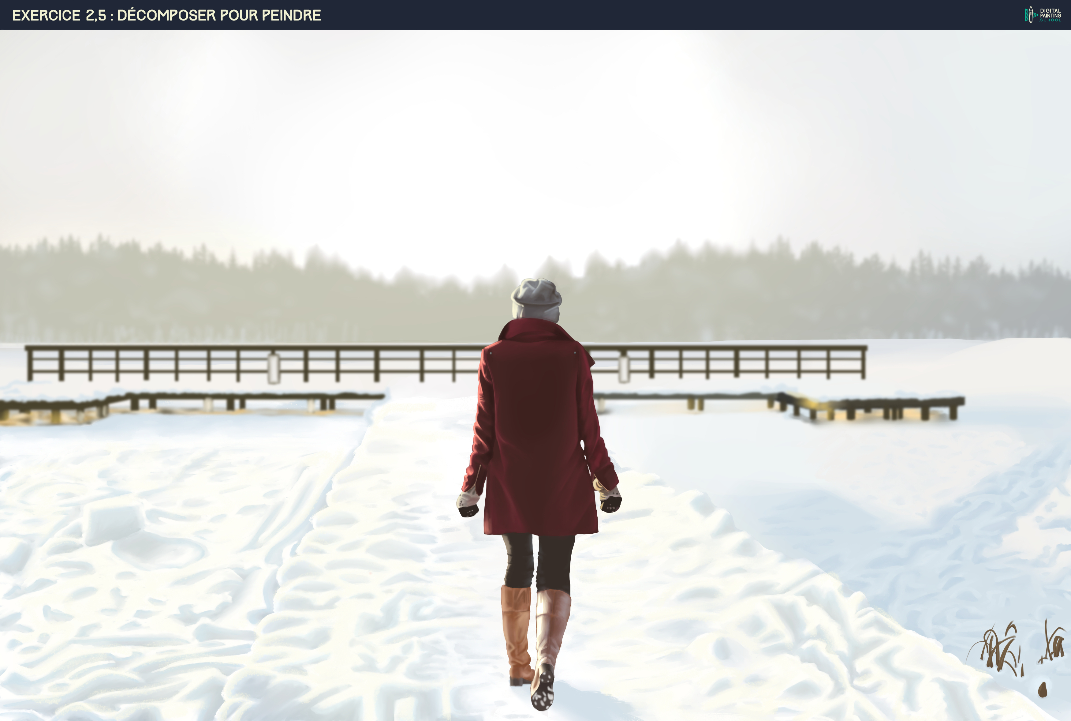 Bonjour, je reviens avec l'exercice 2.5, celui de la femme dans la neige. Je n'ai pas fait exactement les mêmes traces de neige que sur l'image, j'ai essayé de surtout reproduire la matière avant tout. J'ai l'impression que l'image ressort très jaune, mais voilà, enfin fait ! j'attends vos retours avec impatience 😊