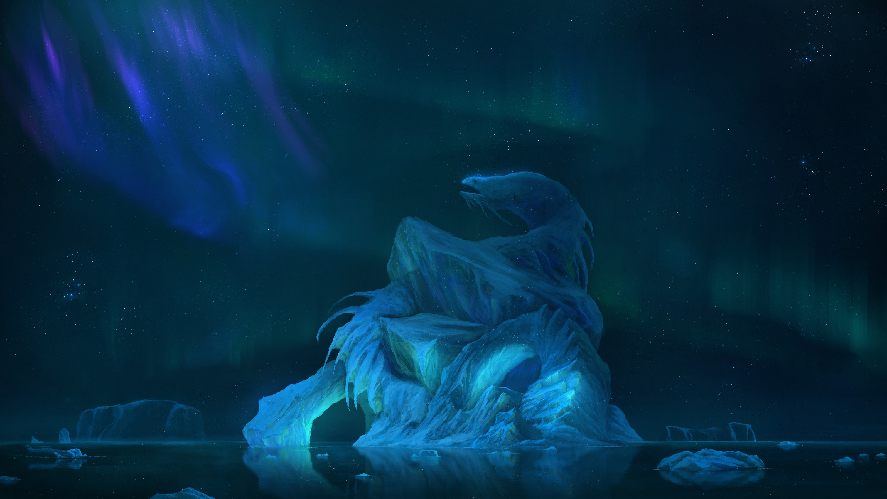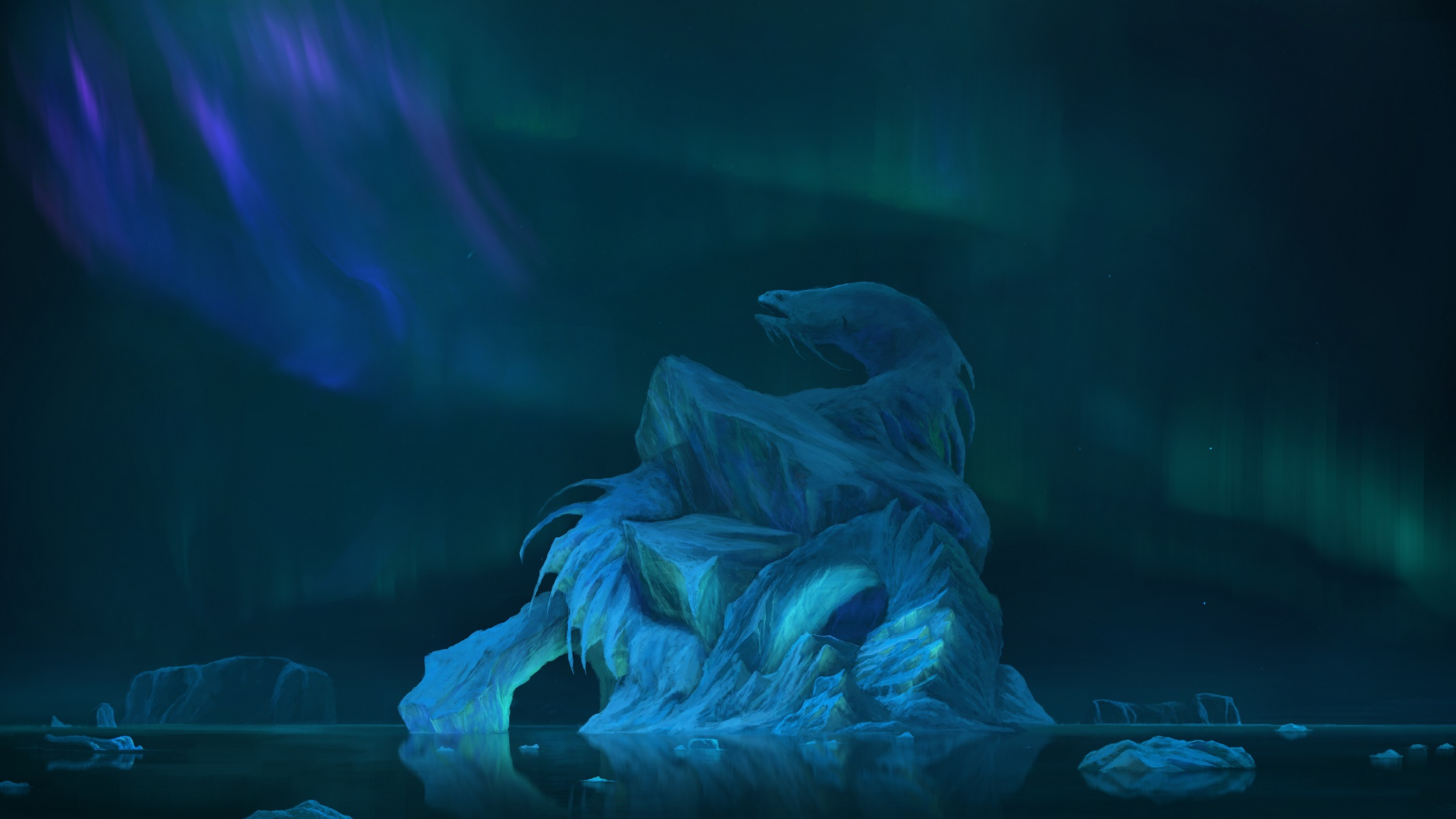 Résultat final : J'imagine que si cette créature fait la taille des contes, il faudrait un icerberg de la taille du mont blanc... on a qu'à dire qu'il s'étend sous l'icerberg ici, après tout on ne voit pas le coté immergé... un peu de photobashing pour les aurores boréales, la violette de gauche c'est "fait main" la tête du serpent est inspirée par une tête de murène Image avant/après le "traitement" de la lumière et quelques détails -