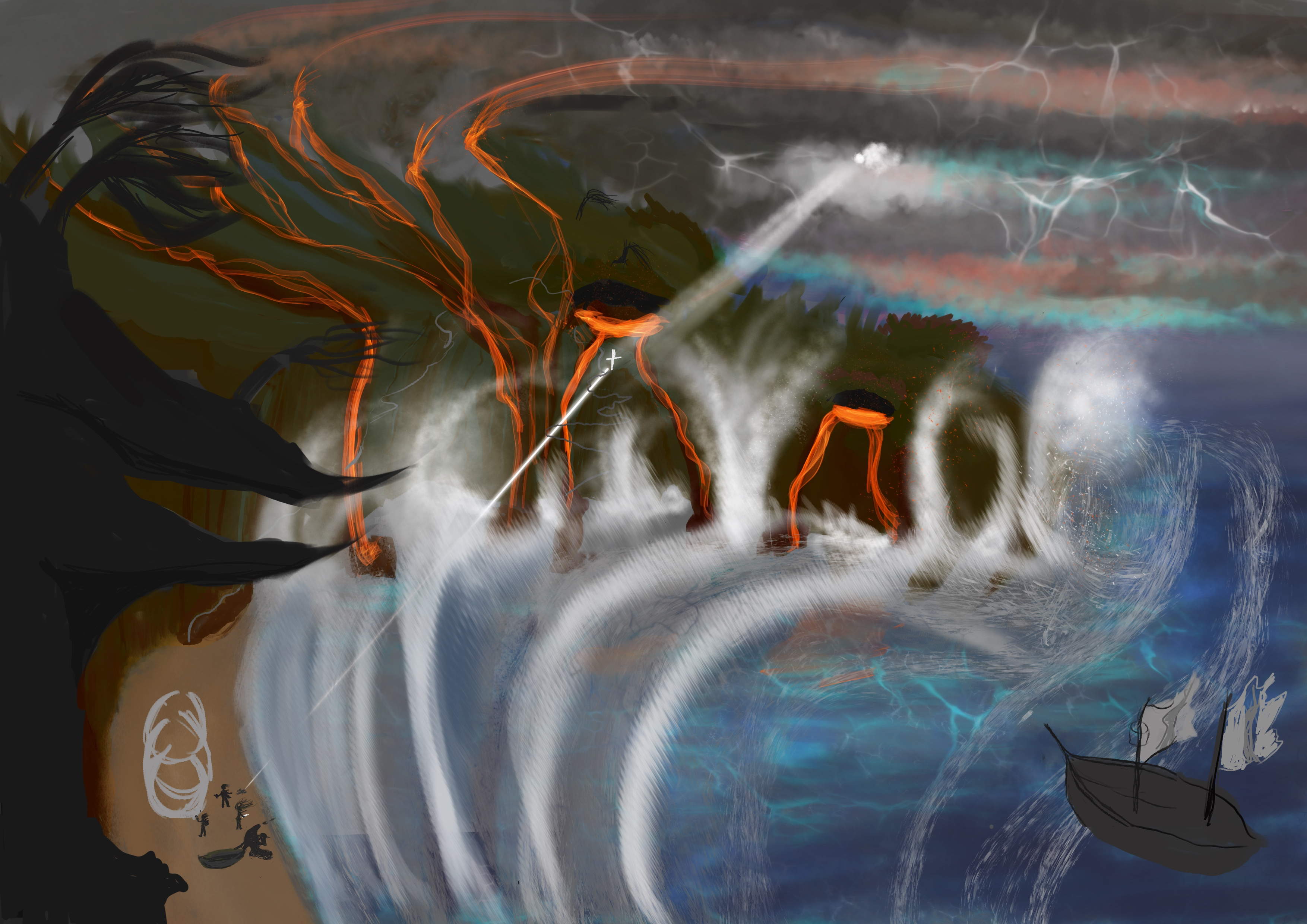 Bonjour, Voici mes recherches du moment, c’est encore très brouillon. 1- pour les couleurs ce n est pas encore ça. Je teste les brush pour voir ce qui est possible de faire. Je pense avoir trouvé pour la lave et les jets de vague. Je n en suis qu aux grosses formes. Le plus dure pour moi sera de rendre l illustration lisible avec les effets de tempêtes que je souhaite montrer : arbres tordus par le vent, ballots de paille qui volent, nuages, brume, etc… je souhaite représenter le mélange mer/lave, fumée/nuage, les éléments de la nature qui se mélangent lors des tempête. Je vais me baser sur des réf de volcan, images de tempête et photos de vacances de bord de mer avec les jets d eau. 2 - pour la compo, je pense rester sur l idée générale qui est de pointer les lignes de force sur la croix qui est l emplacement du trésor. Je souhaite faire une suite du précédent DP réalisé pour ce challenge, peut être que j en fais trop? 3 - Je viens de rajouter les petits perso de la faction des cœurs brûlants, à savoir : Katryna avec sa carte et ses longs cheveux, le perroquet avec son faisceau lumineux, je me demande si je le transforme en Napoleon ou pas. Sakado qui pousse la barque, le chercheur en contemplation devant les fossiles , le capitaine Thomas Paerl qui désespère en voyant les chemins d accès à la croix qui sont impraticables. Pour Gros point, je ne l ai pas encore mis, je vais mieux regarder le grief pour l ajouter dans une posture qui lui corresponde. 4 - le bateau est juste une Ébauche pour le moment 5 - le ciel, je souhaite faire une éclaircie qui pointe sur la croix et des gros nuages, avec des effets de lumières, j ai des réf je dois nettement l améliorer. Je souhaite mélanger les filets de fumée provenant du volcan aux nuages. 6 - je cherche à rendre l île en apparence d un dragon tout en restant réaliste sur une forme de montagne, l idée me vient de l île de La Palma où les bords de mer sont en forme de têtes de dragons endormis. Contrairement au DP de Katryna, ici je tente l autre méthode vue en cours pour les paysages (je suis au chapitre sur la compo de la partie 1, donc cela me permet de mettre en pratique). Je tâtonne pour trouver la forme et les couleurs par l’expérimentation directe sans calculer à l avance et juste en partant d’un croquis très léger au départ. voilà, vos remarques sont les bienvenues même si je n en suis qu’au tout début.