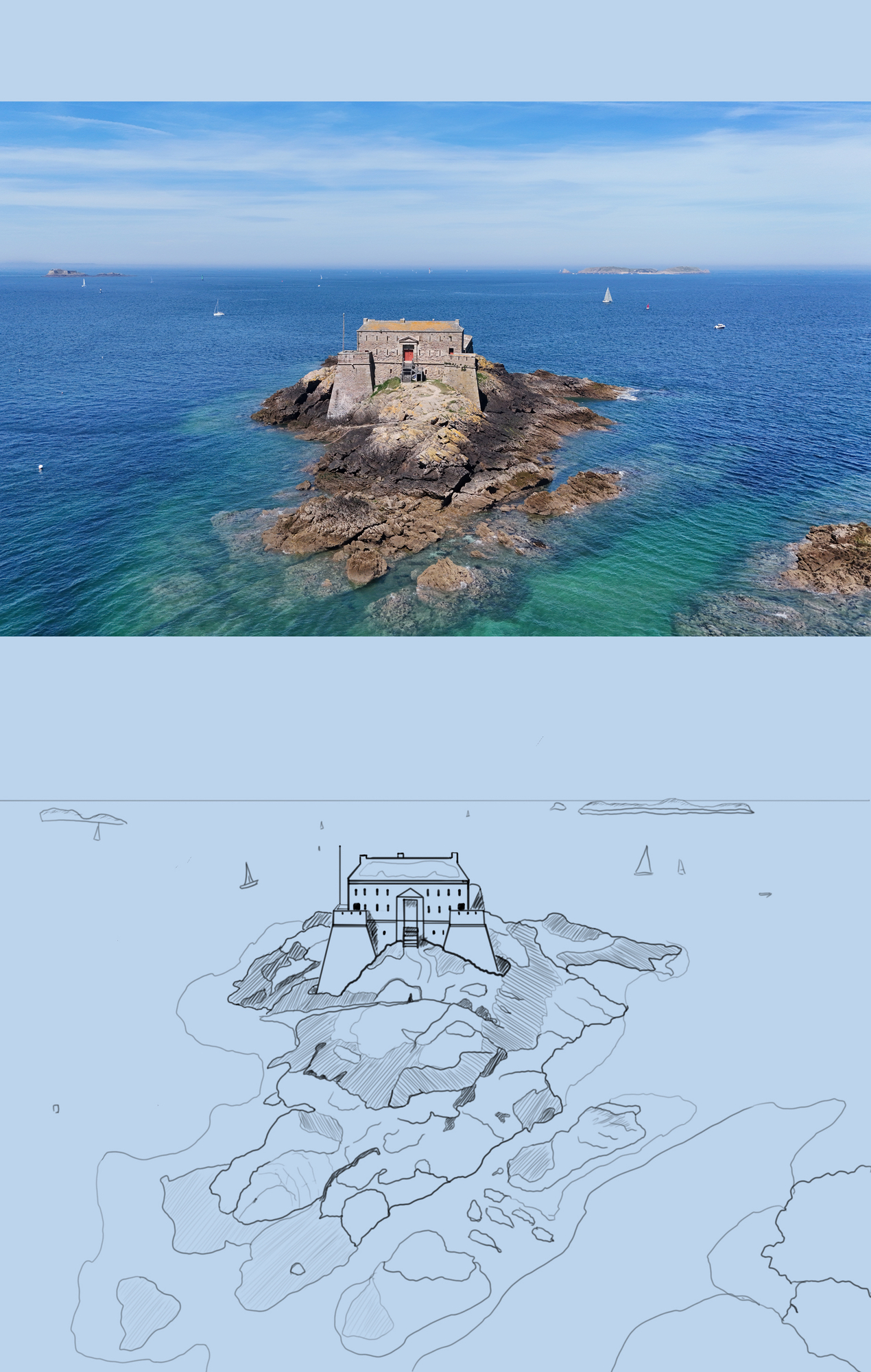 voici un croquis d'une photo du fort de saint malo faite avec mon drone pendant mes dernières vacances . je suis pas très sur de mon coup pour les traits , dès qu'il à de l'eau , je nage complètement ( sans faire de jeu de mot) ^^ merci -