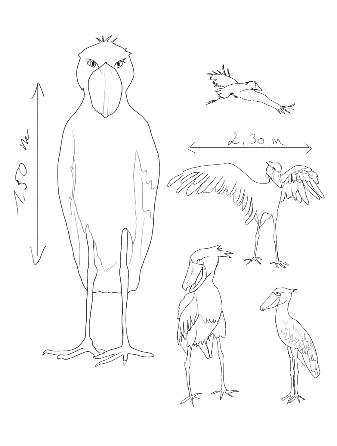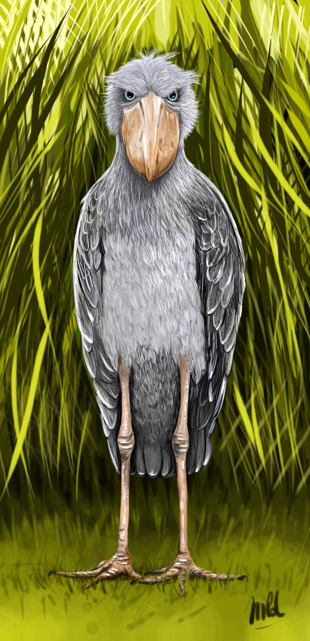 Pour ce deuxième sujet, les oiseaux, j'ai choisi un échassier que j'adore, le Bec-en-Sabot du Nil ! un oiseau fascinant que j'ai déjà peint, mais au pastel sec. J'aime sa grandeur, son envergure, son air rochon et mauvais, ses pattes en forme d'étoile de mer, sa couleur bleu gris et surtout son bec tacheté et très imposant ! Oui, cet oiseau ne s'en laisse pas compter ! même les crocos s'en méfient... j'ai dessiné son corps d'après photos et livres sur l'Afrique, j'ai choisi diverses poses puis j'ai finalisé avec un portrait en pied (ou en pattes) en utilisant mon Painter 2023 de chez Corel, comme d'habitude, avec les outils ''crayon'' et ''plumes''. J'espère que vous apprécierez mon bel oiseau qui fait en plus - et malheureusement - partie des espèces en déclin !