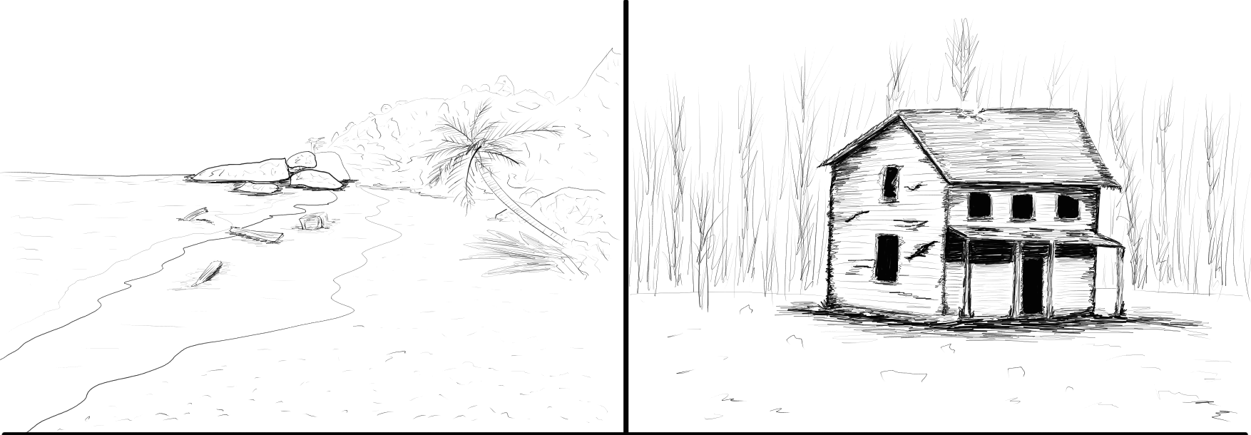 Encore plein de belles choses aujourd'hui ! Bravo à toutes et à tous. Pour ma part, deux croquis simples : Une plage avec quelques restes d'un naufrage récent et une vielle cabane abandonnée dans les bois, pour un projet à venir (peut-être) dans lequel j'envisage de faire commencer les joueurs dans un lieu de ce type, type croquis monochrome (probablement pixel-art aussi) avec un développement dans le style de Memento de Nolan, on démarre sans connaissance, totalement amnésique et le but et de reconstruire son histoire à partir d'un lieu isolé (autre idée: caverne, plage style Ireland, désert, désert de glace, montagne, ruine quelconque etc) et au fur et à mesure que les souvenirs reviennent, les dessins s'améliorent, plus de couleurs, meilleurs résolution, etc -
