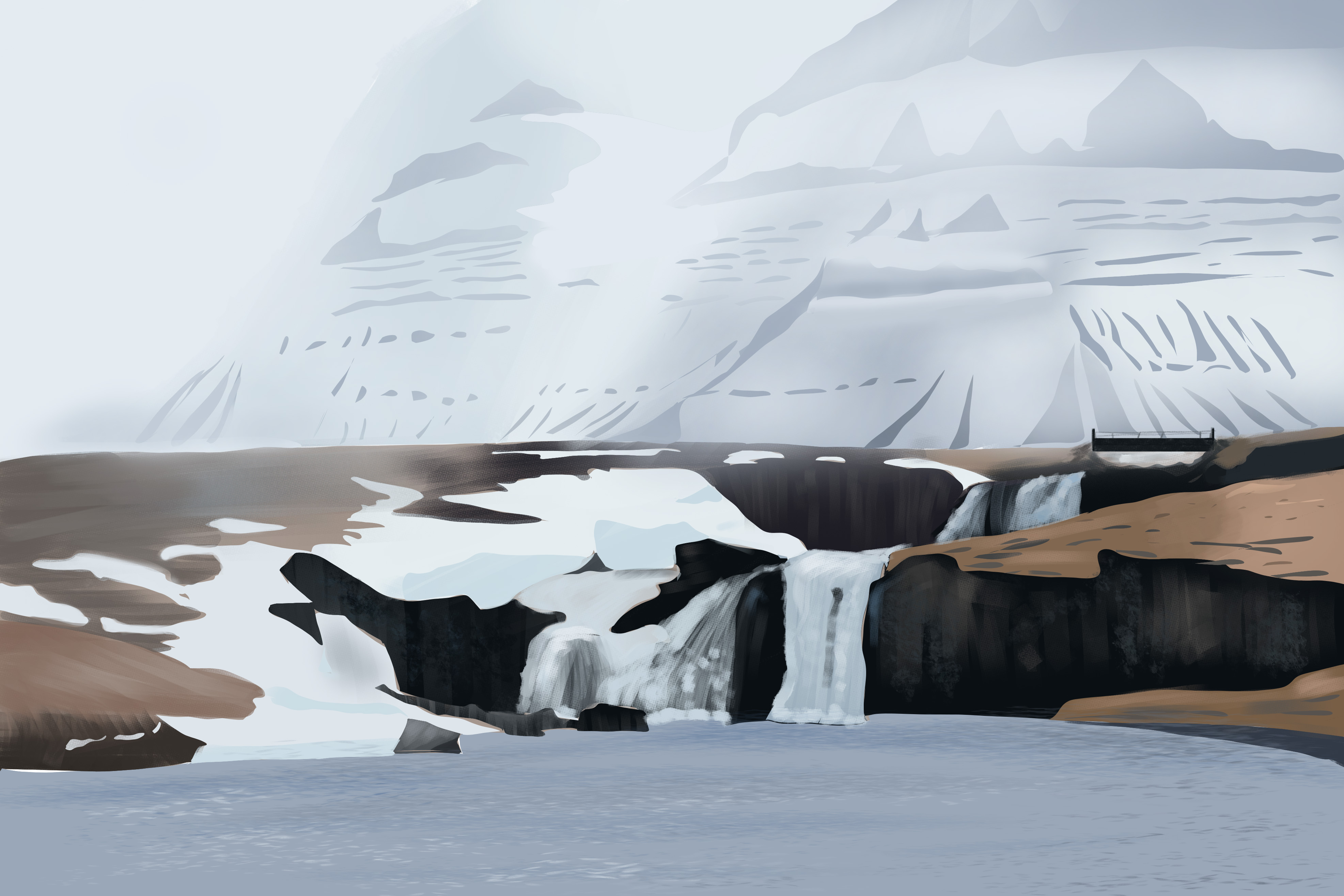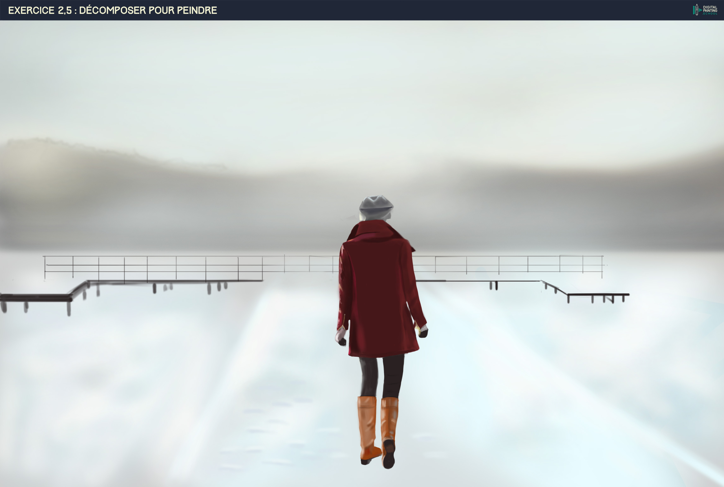 2. Bonjour ! J'avais oublié de publier ma retouche pour l'exercice 2,5, j'ai modifié la tête et relevé la ligne d'horizon. Je n'arrive vraiment pas la neige, je vais essayer de la travailler à part je pense. Les jambes, c'est toujours compliqué ! Pour la suite, j'avoue avoir été un peu lassée des détails de la montagne, je trouve que ça ne rend pas du tout ce que ça devrait ... je fais une pause avant de revenir dessus.
