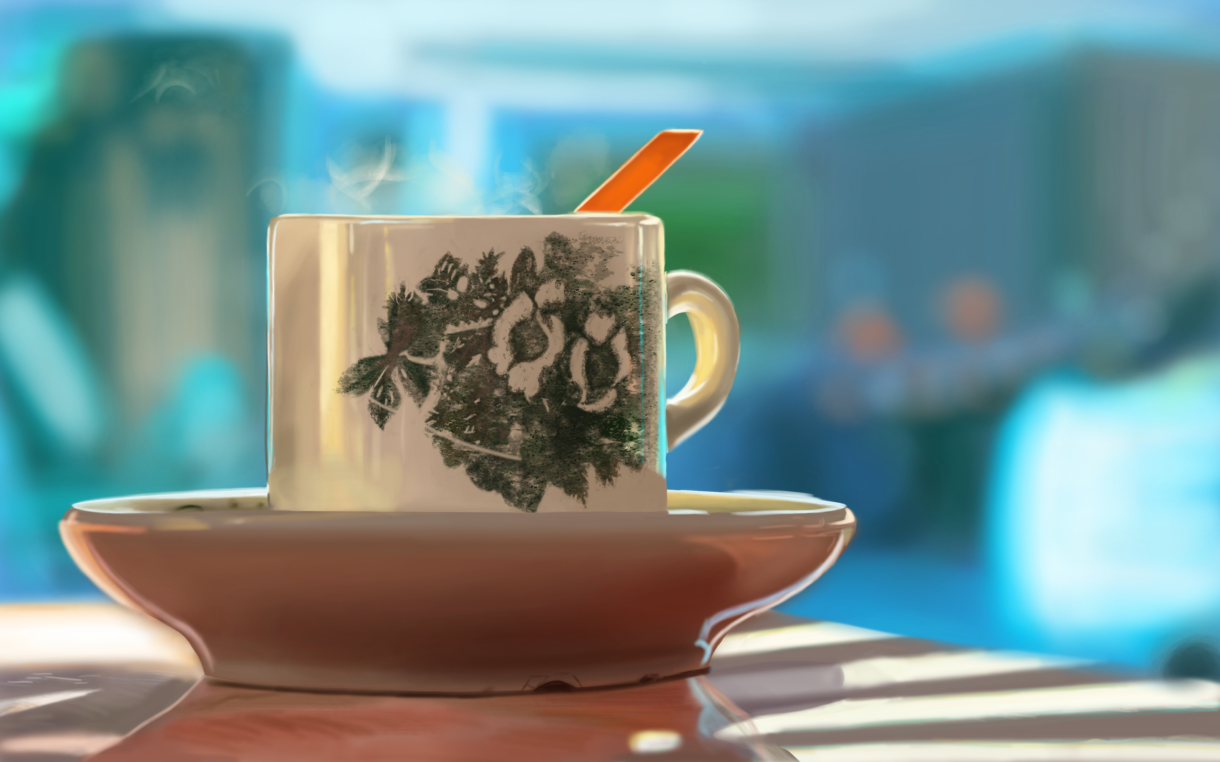 Oki on avance, ici je pense que tu peux simplement mettre un coup de flou en bas : Et il reste ce blending : qui n'est pas assez prononcé La transition devrait être vraiment plus douce. Sinon pour la tasse oui c'est bien mieux, attention au niveau du sol; il manque un peu de highlights sur le reflet pour bien le séparer de la table, aussi tes lumières blanches sur la table sont un peu trop nettes. Sinon pour la rose c'est mieux, Un peu plus vert sur cette zone là, je pense que Joris parlait de plus chaud un peu plus haut, en fait on a une transition avec du rose en haut et du vert en bas, et tu étais à la base un peu trop bleu partout. Aussi ton ombre ici est un peu trop foncée : Mais mieux vaut ca que l'inverse 😉 Keep it up !