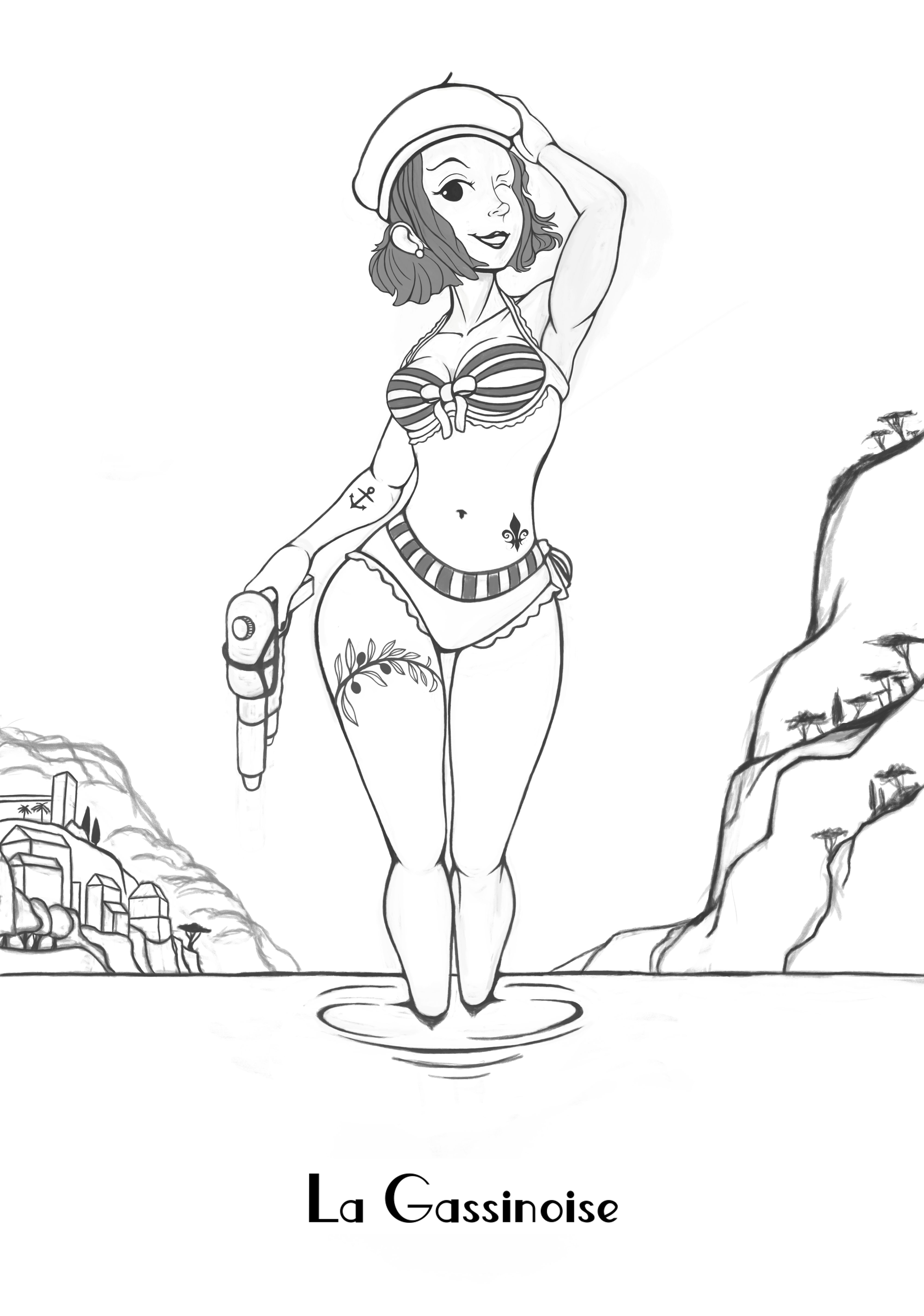 Hello 🙂 Voilà un nouvel update. Je travaille toujours sur le croquis, mais je pense qu’on s’approche de la fin. Je vais bientôt pouvoir attaquer la prochaine étape, à savoir les valeurs. Pour la faire courte : Les tatouages (avant-bras et cuisse) ont été revus pour un design plus simple. Les cheveux : au départ, je voulais partir sur des cheveux mouillés, mais finalement l’idée ne me plaisait plus trop. Je trouvais que l’association cheveux mouillés + béret n’avait pas vraiment de sens. J’ai donc opté pour des cheveux secs ^^, avec une coupe French Bob (française et old school, donc pile dans le thème). Le décor : j’ai commencé à le poser. Il faudra encore l’affiner, sans trop détailler non plus. J’ai essayé de partir sur une ambiance méditerranéenne pour rester cohérent avec le painting. Voilà 🔫 🌞 À bientôt pour la suite ! -