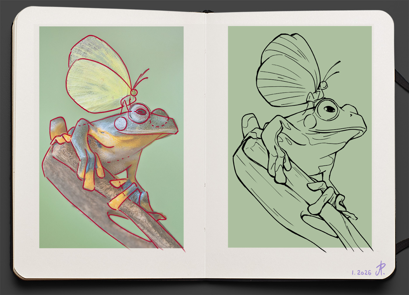 Finalement, j'ai trouvé le temps de retravailler sur ces 2 images, en essayant de me rapprocher un peu plus de ce que mes camarades sur le forum ont postés pour cet exercice 🙂. J'ai surtout essayé de décomposer le sujet et de synthétiser les formes et en me concentrant sur le poids des lignes pour que ce soit lisible... J'espère que je suis dans la bonne direction cette fois 😅 - Aujourd'hui