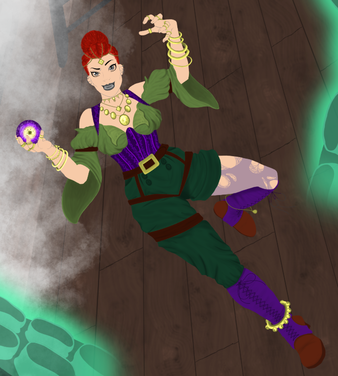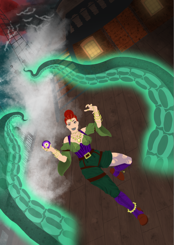 Aujourd'hui j'ai commencé les détails et fait un premier jet de couleurs \o/ Il me reste encore à : - ombrer la peau, le visage, etc - Faire le manteau posé sur les épaules comme une cape - Les armes (? je sais pas, j'hésite, quand même un pirate à au moins un sabre, une dague ou un pistolet) - Faire le cercle d'invocation - Les effets de magie/lumière Je suis assez fière, et ça va rendre bien pour un dessin étalon de chapitre 0 😄 -