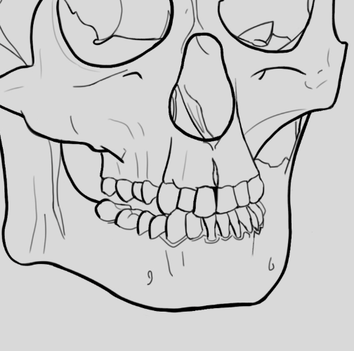 Salut @Walvyn, Pour te répondre, tout est une question de compartimentation en fonction de l'étape où tu en es : par exemple, la toute première étape, tu vas faire en sorte que ce soit les formes et les proportions globales qui sont justes et solides. C'est seulement avec l'étape 2 où tu vas affiner un peu plus que tu vas te soucier de détails moins "grands" comme par exemple, la forme du nez, des orbites, les dents, etc... Et enfin, dans la dernière étape, tu pourras encore affiner un petit peu tout ça. C'est un processus purement itératif où chaque étape a sa "mission" principale en gros 😉 En tous cas, ta nouvelle version est beaucoup mieux, c'est bien ! Les 2 choses que je verrais encore à ajuster serait : - Pour la cavité nasale, lui faire faire une légère rotation vers la droite pour simuler l'angle de cette partie là. Sur un crane, cette cavité n'est pas parfaitement droite et "plane" sur le devant du visage, elle point légèrement vers le bas, c'est ça qu'il faut émuler ici. - L'espace entre la dentition et le bas de la mâchoire (menton) est encore un peu faible. N'hésite pas à remonter le tout de quelques pixels. Voilà tout, bon travail !