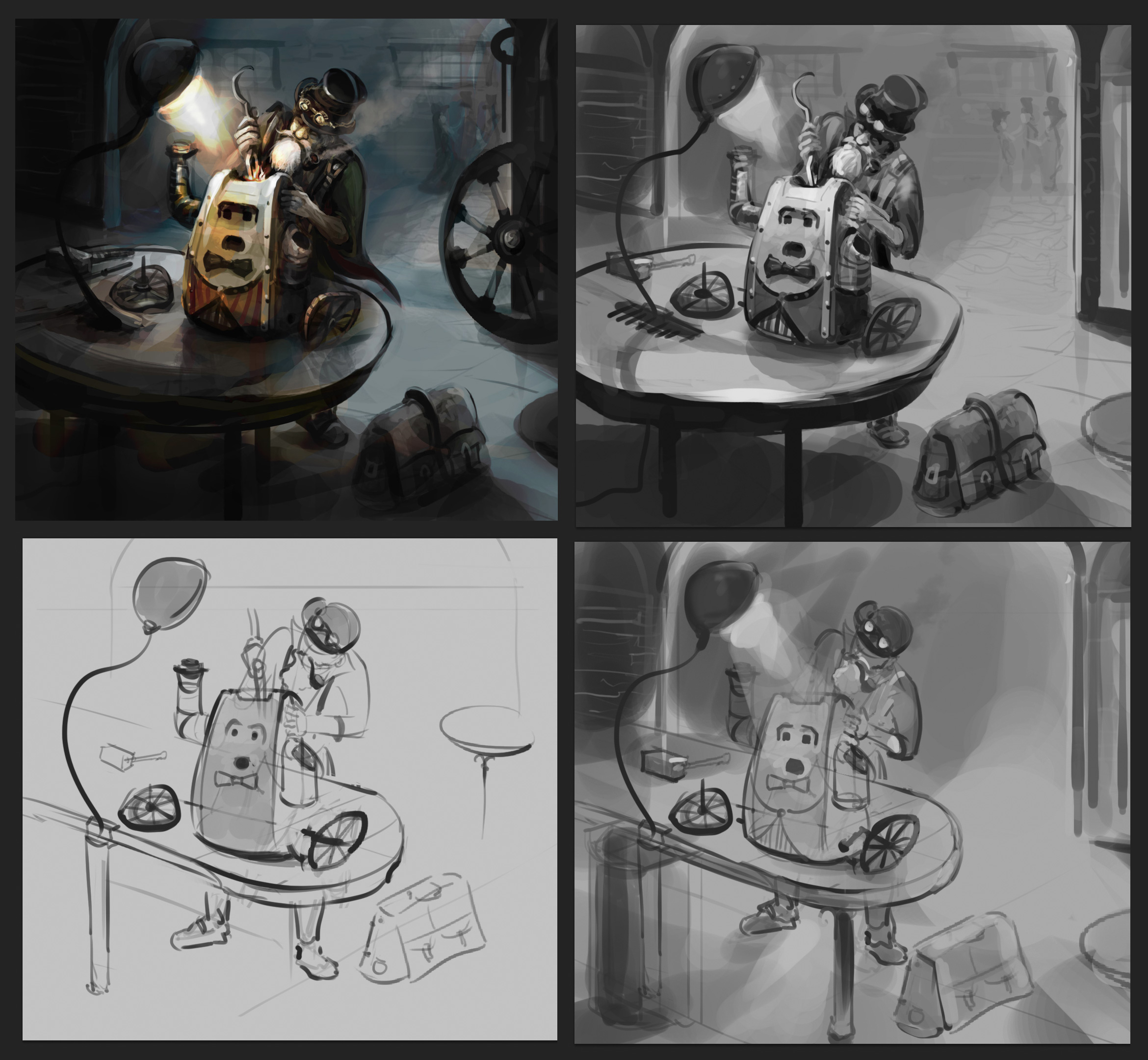 2. J'adore! @Julie L Très chouette la gestuelle bercer/réparer. J'ai quelques éléments qui me viennent en tête pour quand tu l'as reprendras. - pour quoi faire cette perspective si prononcée au niveau du sol. Ça l'a déséquilibre totalement. Quelque chose de plus stable irait dans le sens de la douceur qu'inspire cette illustration. - la lanière qui passe sur le dessus de la tête me semble mal placée. Ce serait bien d'ailleurs de soigner le design de la lampe. Trouver 1 truc un peu plus rétro. - la perspective du côté gauche de son visage n'est peut être pas tout à fait juste. T'as fait un flip pour vérifier ? Moi j'oublie tout le temps mais sur ce genre de truc ça peut aider à vérifier. En tout cas, ça va être top ! J'ai hâte de voir la suite. 😛