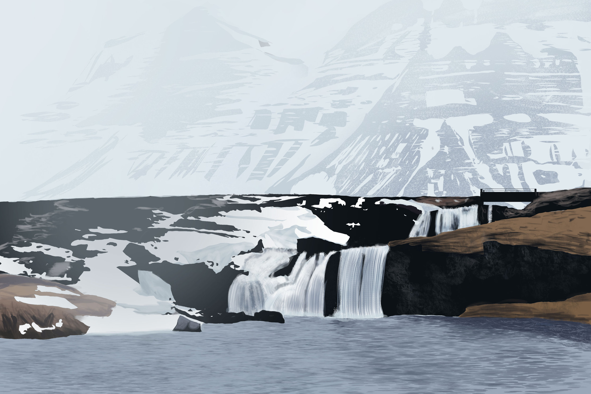 Merci infiniment pour ton retour @JorisHalgand. Sur l'exo 2, effectivement, j'avais un peu de mal avec la gomme, elle faisait pas toujours ce que je voulais, j'ai du un peu ruser :/. + Le violet, je n'ai pas réussi à le reproduire, et je n'ai même pas essayé de la pipeter, je n'y ai pas pensé :D. Les deux autres formes, le gabarie était très galère à reproduire... Concernant l'exo 2.5, j'ai essayé de trouver les couleurs moi même. Mais a priori, elles sont plus vibrantes pour moi que dans la réalité haha. Je voulais corriger les couleurs et aussi flouter la ligne comme tu l'a dit, mais je me suis foiré, j'ai fermé mon fichier PSD sans l'enregistrer en pensant que c'était déjà fait... du coup ma dernière sauvegarde est beaucoup trop loin pour recommencer... Tant pis, si il s'agit que de couleurs, ça va, c'est pas le pire... Vraiment merci en tout cas. j'ai enchainé sur la suite, j'avais trop hâte de finir la cascade... Cette fois ci j'ai utilisé les couleurs et le croquis donné, je ne me suis concentré que sur le lasso et les différents brush : Je n'ai pas du tout regardé la vidéo démo de Spartan... j'avoue que les cascades étaient moins difficiles que la dernière fois avec un meilleur brush. Bonne soirée !